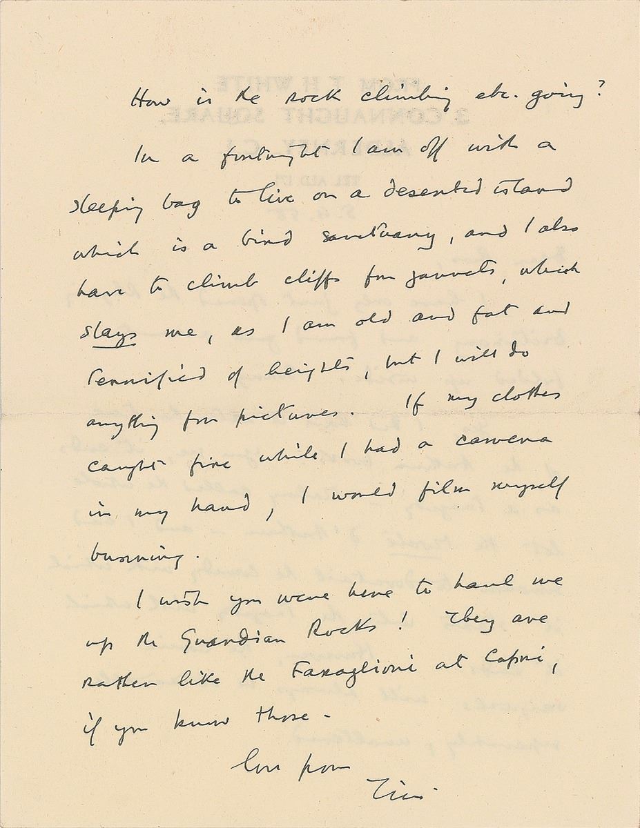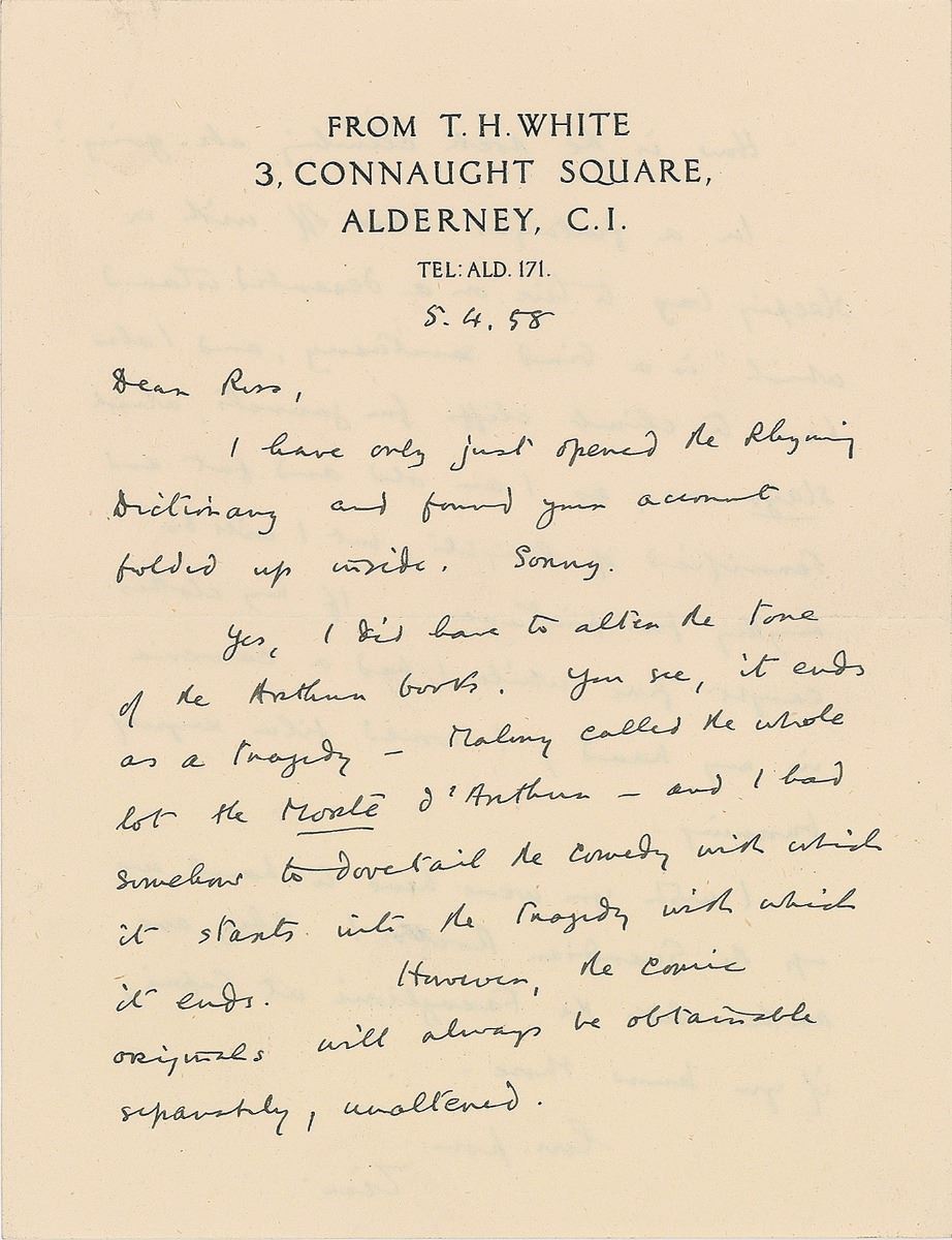 English author (1906–1964) best known for his Arthurian tetralogy The Once and Future King, which includes the popular story The Sword in the Stone. ALS signed “Tim,” one page both sides, 5.25 x 7, personal letterhead, May 4, 1958. Letter to Ross, in part: “I have only just opened the Rhyming Dictionary and found your account folded up inside. Sorry. Yes, I did have to alter the tone of the Arthur books. You see, it ends as a tragedy—Malory called the whole lot the Morte d’Arthur—and I had somehow to dovetail the comedy with which it starts with the tragedy with which it ends. However, the comic originals will always be obtainable separately, unaltered. How is the rock climbing, etc. going? In a fortnight I am off with a sleeping bag to live on a deserted island which is a bird sanctuary, and I also have to climb cliffs…which slays me, as I am old and fat and terrified of heights, but I will do anything for pictures. If my clothes caught fire while I had a camera in my hand, I would film myself burning. I wish you were here to hand me up the Guardian Rocks! They are rather like the Faraglioni at Capri, if you know those.” In fine condition.