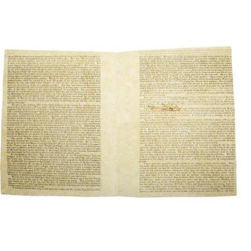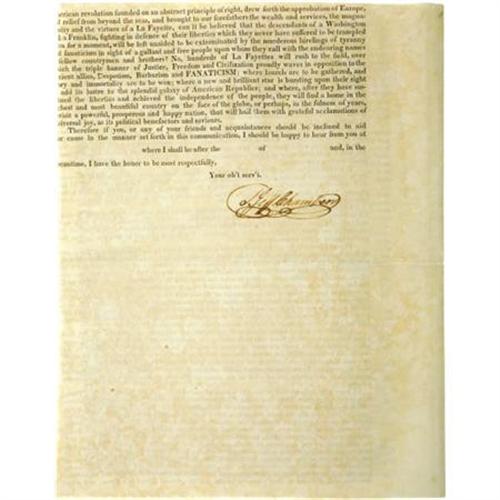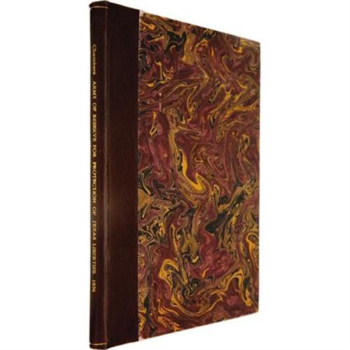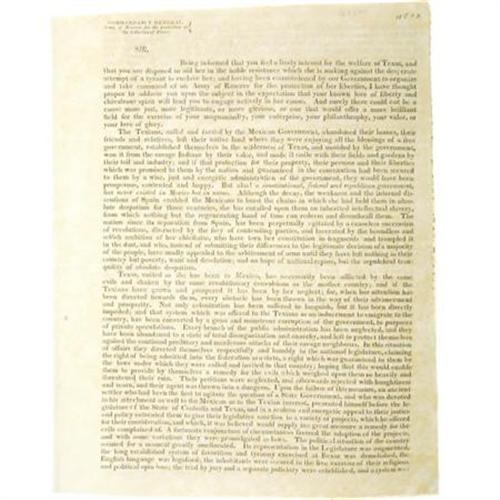 <B>Commandancy General; Army of Reserve for the Protection of the Liberties of Texas,</B></I> [n.p.]. [1836]. Circular/letter printed to accompany subscription lists for loans to the government of Texas. 4 pages, folded, printed on all four pages. Octavo. First edition. Signed by Thomas Jefferson Chambers (first Anglo-American attorney in Texas). <I>"Sir, being informed that you feel a lively interest for the welfare of Texas..."</B></I><BR><BR>On January 7, 1836, the General Council of Texas passed an Ordinance and Decree authorizing Thomas Jefferson Chambers "to raise an army to be called The Army of Reserve," which Governor Smith refused to sign. The following month, on February 23, Chambers left for the United States not to return until April or May, 1837. In this circular letter he enclosed printed copies of the decree just mentioned (purported to be signed by Governor Smith), as well as a copy of his commission as General of the Army of Reserve. In his usual pompous and long-winded style, he related how Texas had been oppressed by Mexico and asked for loans and support. The letter was probably printed in Kentucky by Prentice of Prentice & Weissinger and, as it mentions the taking of the Alamo but not the massacre at Goliad, was probably distributed in April. Housed in a contemporary brown half-morocco folding box with marbled boards and gilt lettering. In very fine condition. Very rare, desirable, and important! <I>From the collection of Darrel Brown.</B></I><BR><BR><B>Reference:</B></I> Streeter<I> Texas</B></I> 1240. For authentication of this broadside see <I>Investigating A Questioned Broadside</B></I>, Andrea Knowlton, Kilgarlin Center, The University Of Texas. See also Streeter 1236.<BR><BR><b>Shipping:</b> Books & Catalogs (<a target="_blank" href="http://www.heritageauctions.com/common/shipping.php">view shipping information</a>)