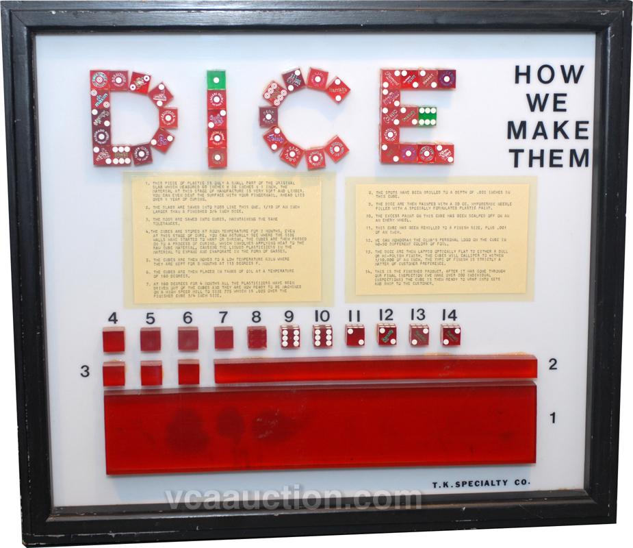 T-K Specialty Dice Making Display – The 24" by 20" framed display depicts the step-by-step process for making casino dice. Large celluloid sheet is warped, otherwise display is in good condition.
