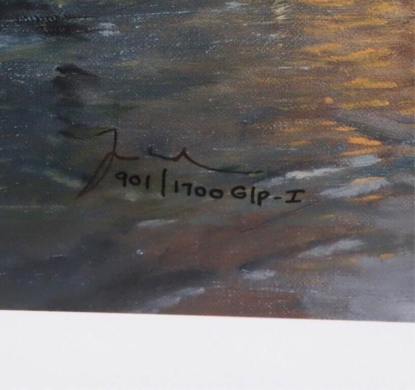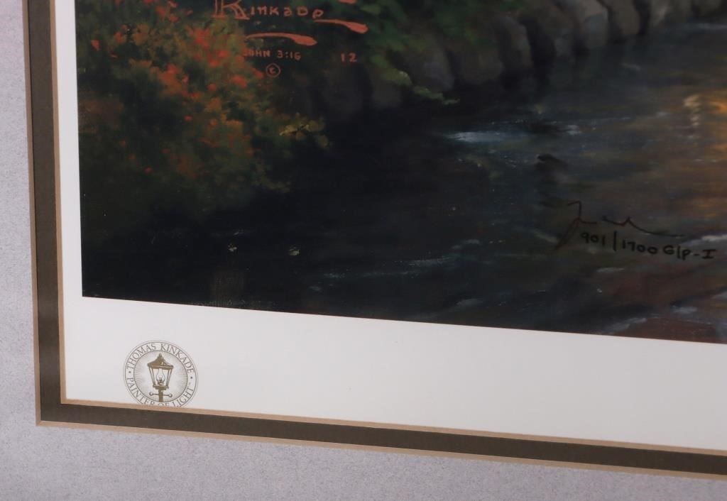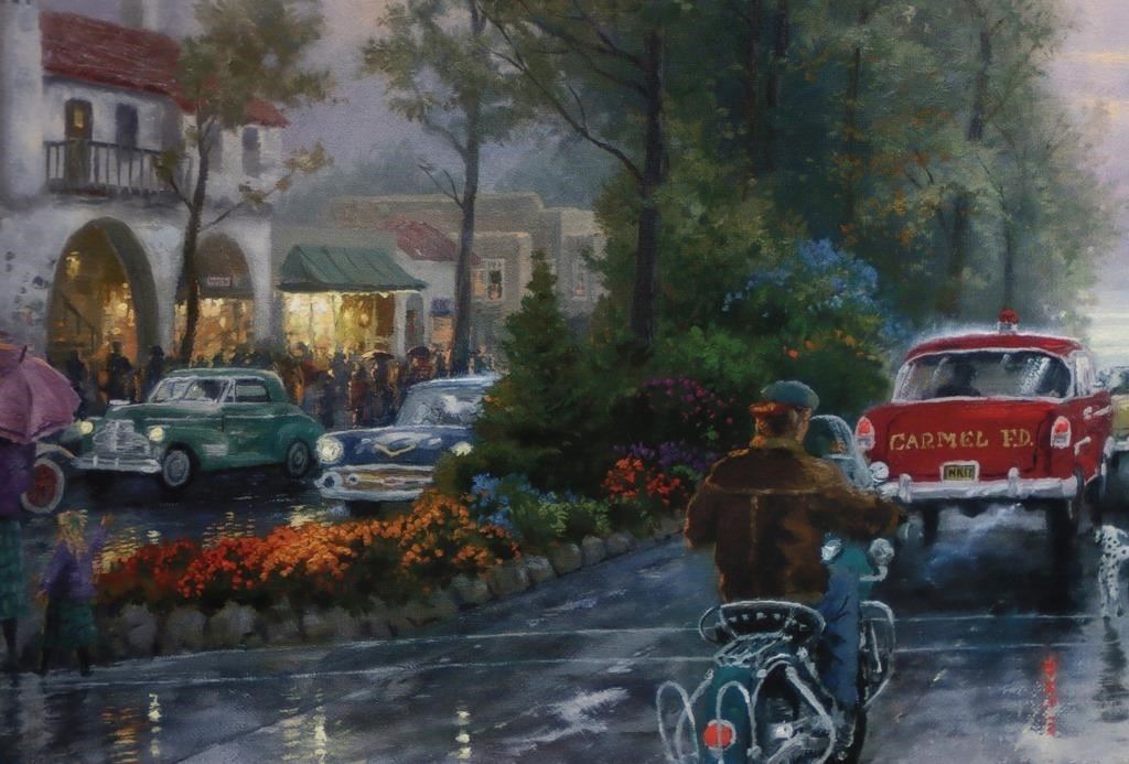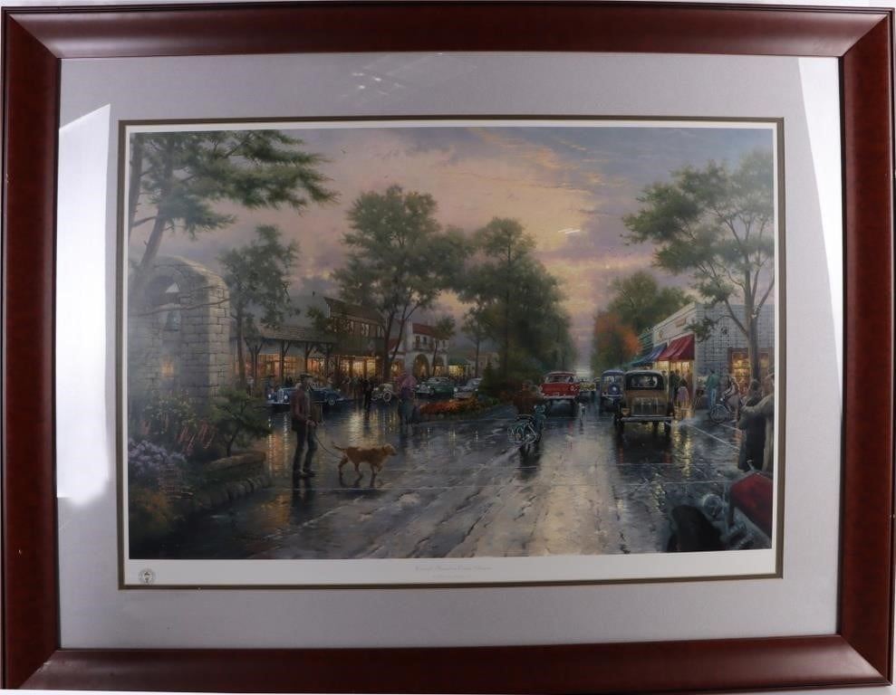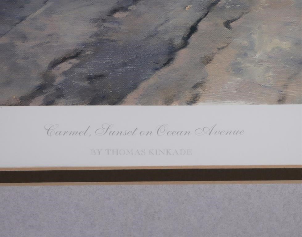 Thomas Kinkade(1958-2012) "Carmel Sunset On Ocean Avenue" signed limited print 901/1700 framed. William Thomas Kinkade III was an American painter of popular realistic, pastoral, and idyllic subjects. He is notable for achieving success during his lifetime with the mass marketing of his work as printed reproductions and other licensed products by means of the Thomas Kinkade Company.