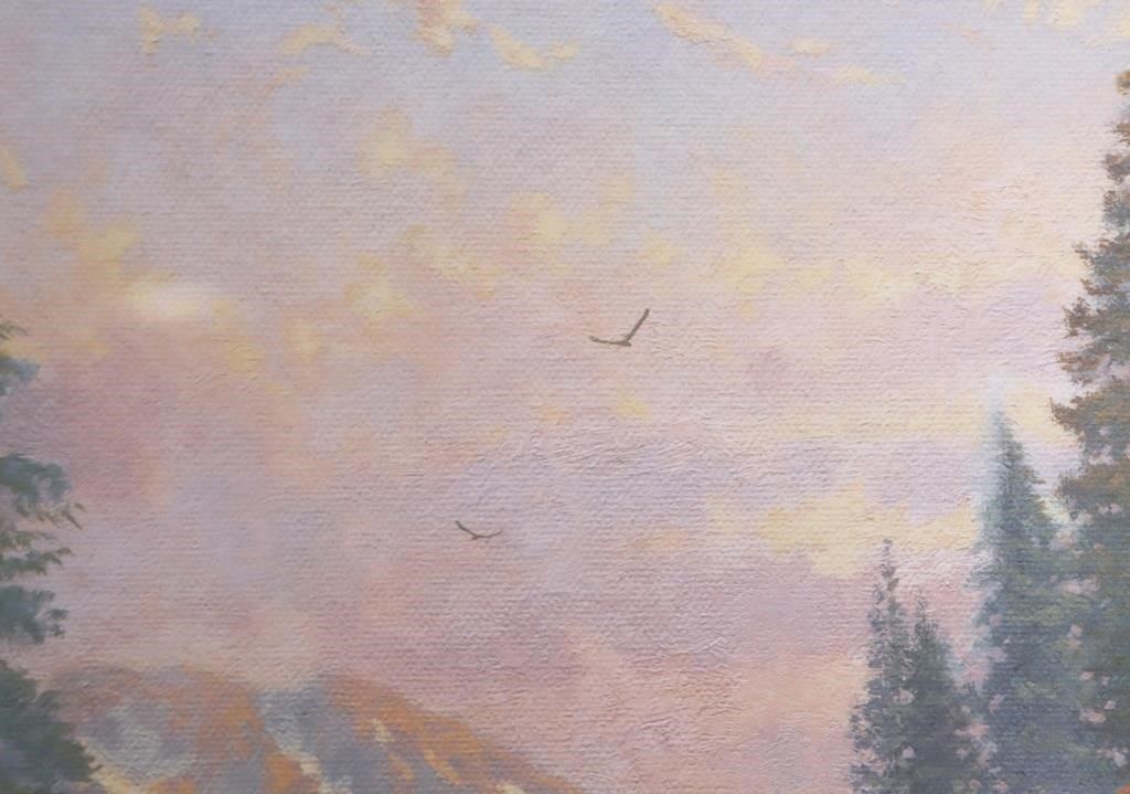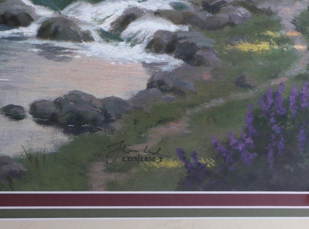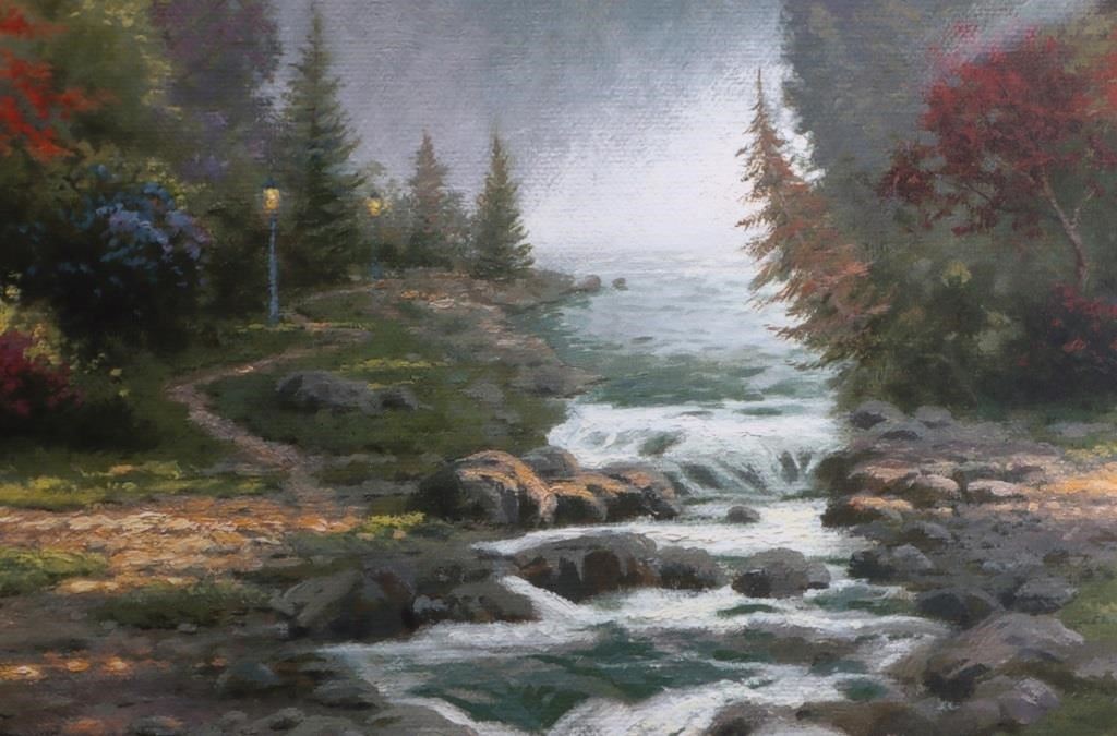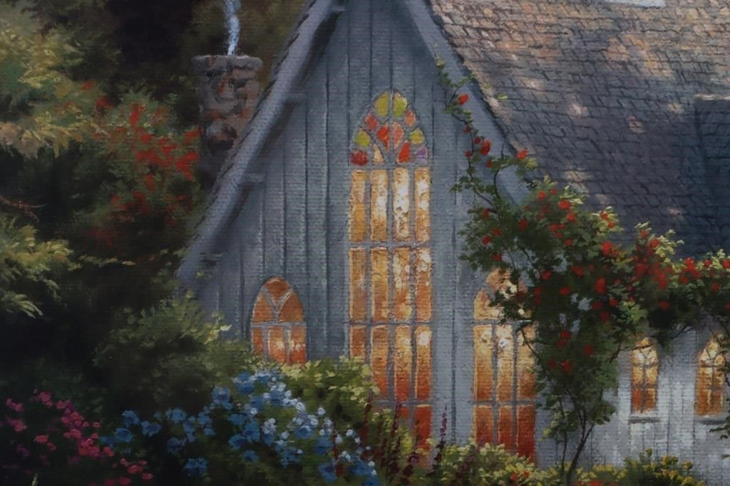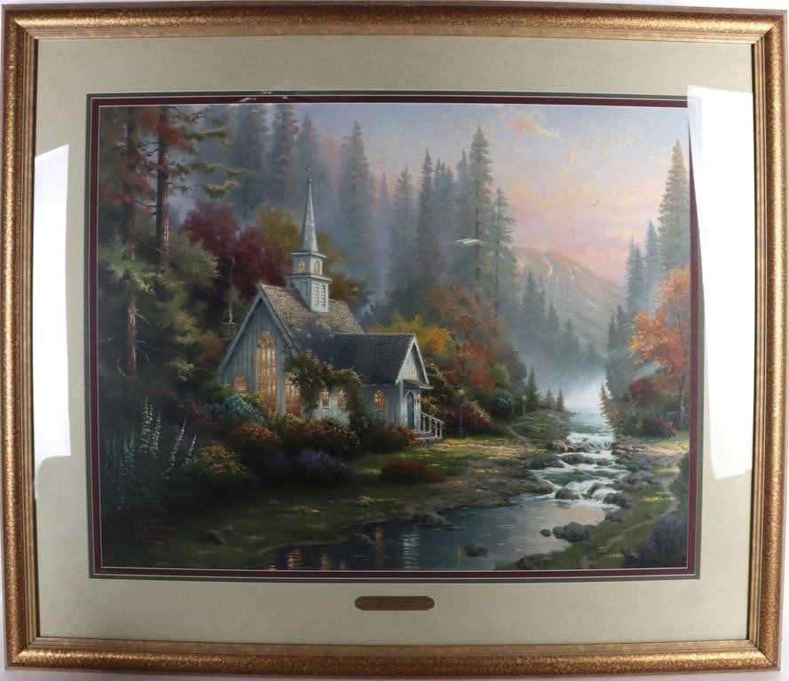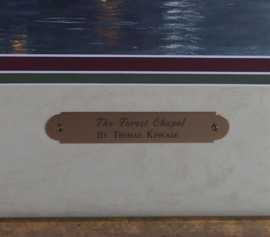 T. Kinkade "The Forest Chapel" signed limited print 2759/2850 framed along with an engraved nameplate. William Thomas Kinkade III was an American painter of popular realistic, pastoral, and idyllic subjects. He is notable for achieving success during his lifetime with the mass marketing of his work as printed reproductions and other licensed products by means of the Thomas Kinkade Company.