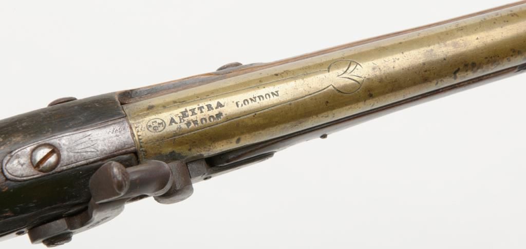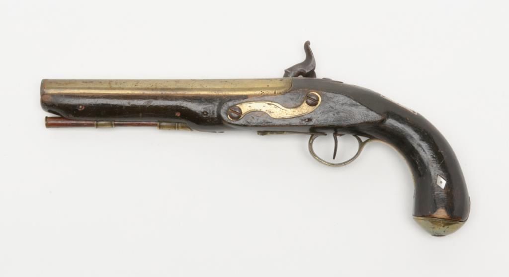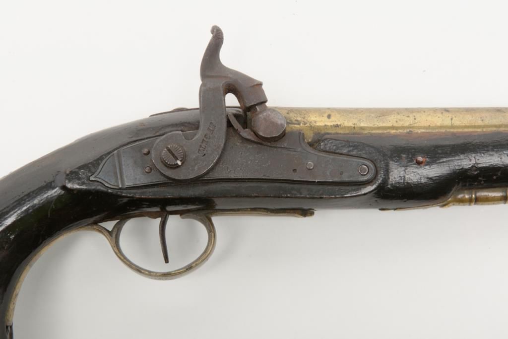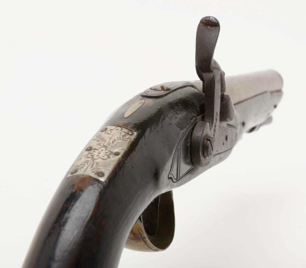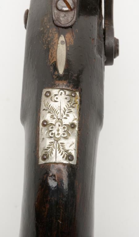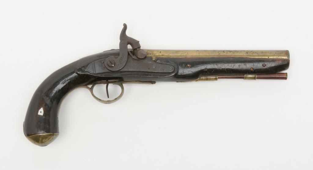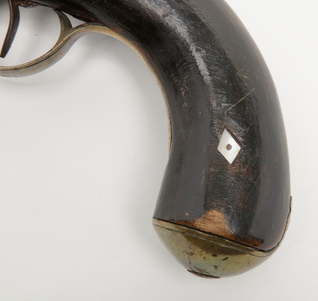 “T. Ketland & Company” signed British style made for export pistol converted from flintlock to percussion with the hammer marked “A.F. Getz” who was a well-known Philadelphia maker. The pistol measures 14” overall with an 8” brass barrel ofapproximately .52 caliber smoothbore. The barrel shows “extra proofs” and “London” marking along with “E.L.G.” Belgian proofs. The stock shows a square German silver inlay at the wrist and a small teardrop shaped inlay along with one smallPearl inlay in each side of the stock. The lock shows a deep brown patina finish and the hammer matches the condition of the lock well. The stock shows a few losses, normal aging and minor scratches but is at least good to very good. Aoriginal to the period ramrod is included which may be the original to this pistol. The lock works well. It is our opinion that this is a Belgian made pistol infringing on the style and name of Ketland that was imported to America and converted by Getz. Probably used in the fur trade era or early Western expansion. Est.: $900-$1800