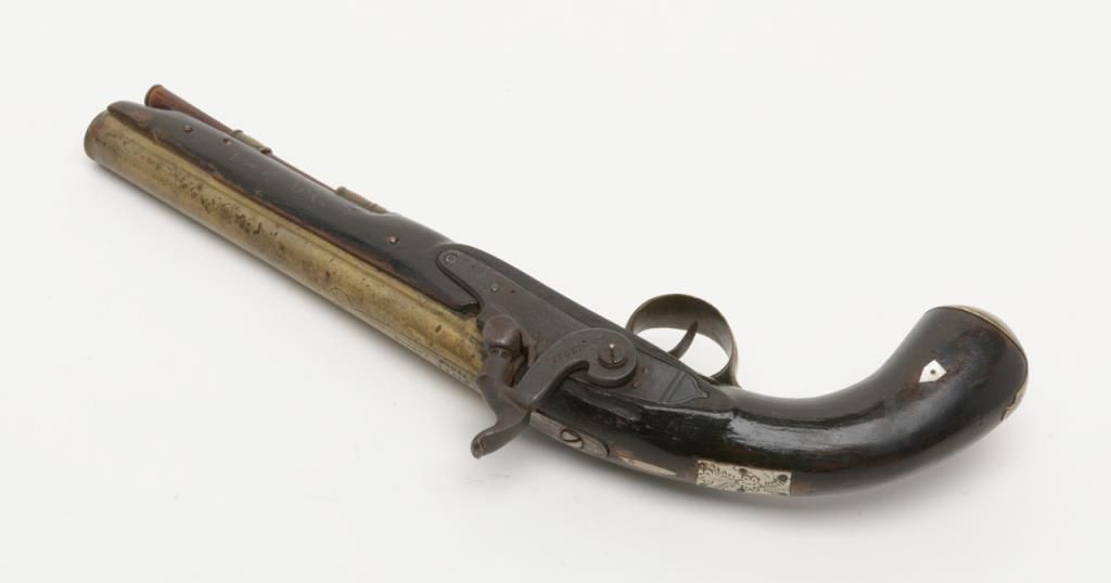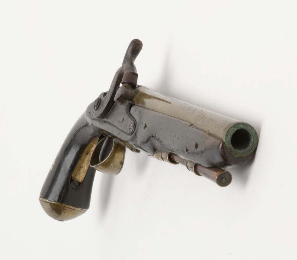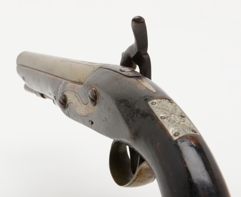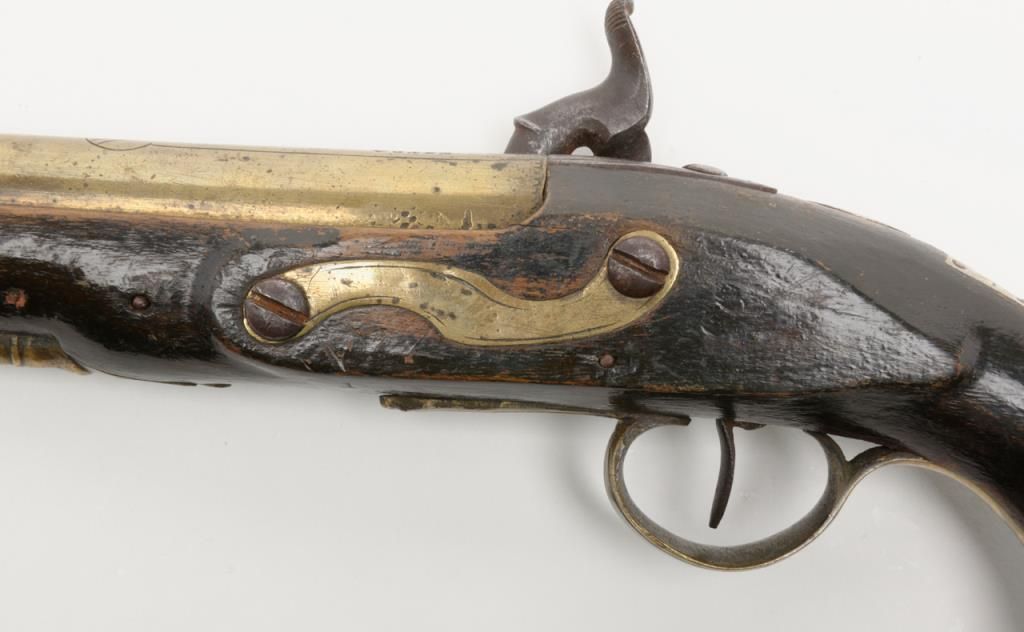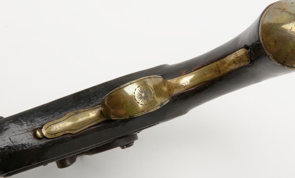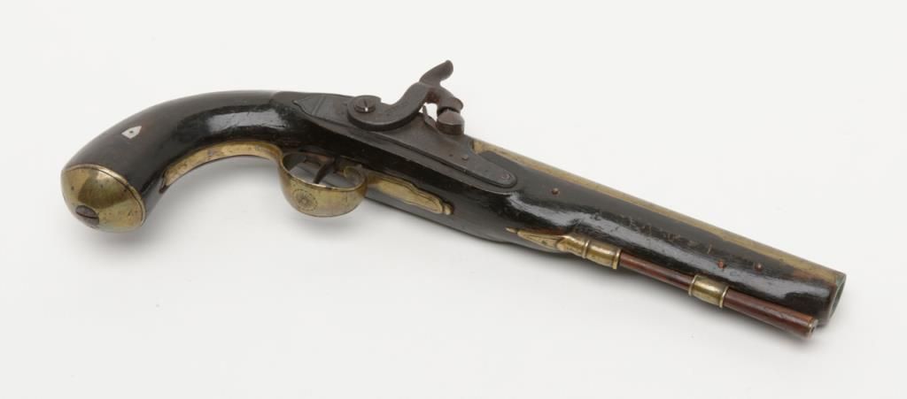 “T. Ketland & Company” signed British style made for export pistol converted from flintlock to percussion with the hammer marked “A.F. Getz” who was a well-known Philadelphia maker. The pistol measures 14” overall with an 8” brass barrel ofapproximately .52 caliber smoothbore. The barrel shows “extra proofs” and “London” marking along with “E.L.G.” Belgian proofs. The stock shows a square German silver inlay at the wrist and a small teardrop shaped inlay along with one smallPearl inlay in each side of the stock. The lock shows a deep brown patina finish and the hammer matches the condition of the lock well. The stock shows a few losses, normal aging and minor scratches but is at least good to very good. Aoriginal to the period ramrod is included which may be the original to this pistol. The lock works well. It is our opinion that this is a Belgian made pistol infringing on the style and name of Ketland that was imported to America and converted by Getz. Probably used in the fur trade era or early Western expansion. Est.: $900-$1800
