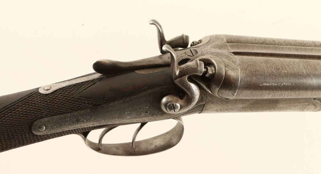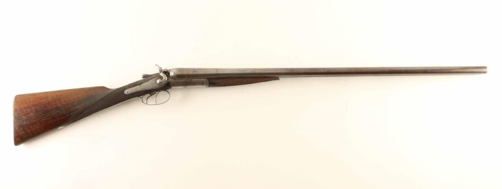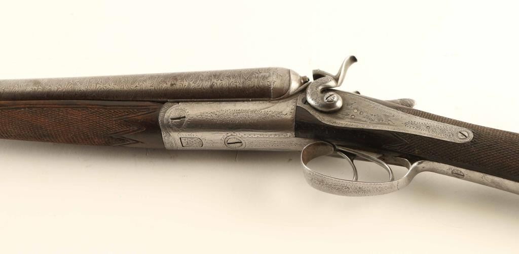 Antique high quality English made side-by-side double barrel exposed hammer shotgun chambered for 12 gauge shells, manufactured circa 1875-1887. Features 30" damascus barrels with concave sighting rib & 2 1/2" chambers, extractor, silver bead front sight, double triggers, knurled hammer spurs, knurled top lever, floral scroll engraved receiver with dog & duck scenes on the lock plates, hand checkered walnut splinter forend and straight grip shoulder stock with inlayed oval escutcheon & serrated bare butt. The barrels exhibit nice damascus patterns with approximately 60% brown retained also showing a small amount of pitting towards the muzzle and some scattered rust tones near the breech. The balance of the metal surfaces display a grey patina with softened engraving on the underside of the receiver and triggerguard. Action is smooth, the bores are bright with some small dings and the wood stocks are near good with sharp checking on the forend, a repair to the left side of the butt & many blemishes. Condition is NRA Very Good. ***Antique Firearm***