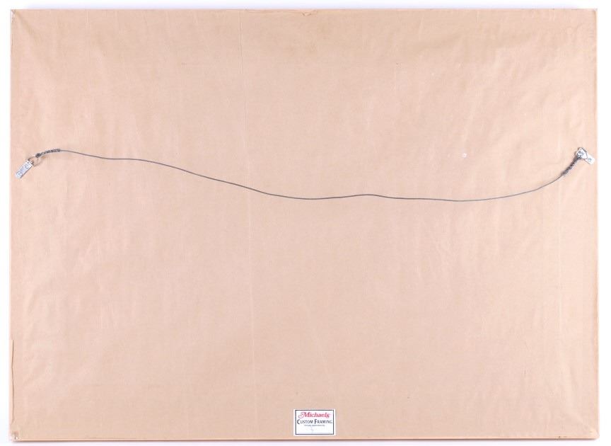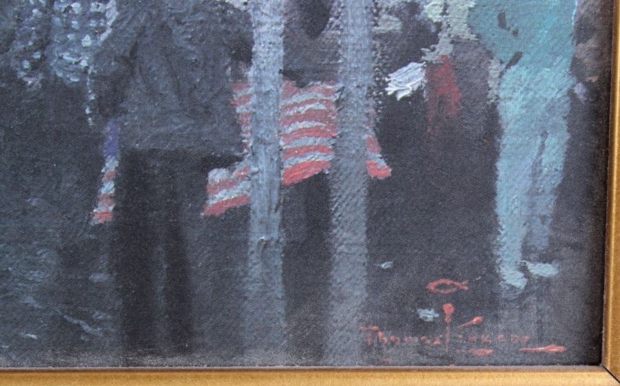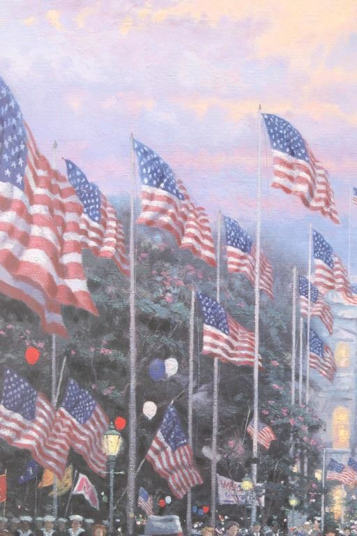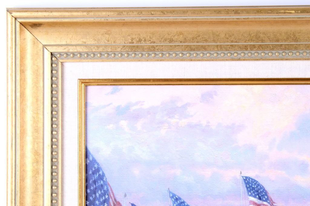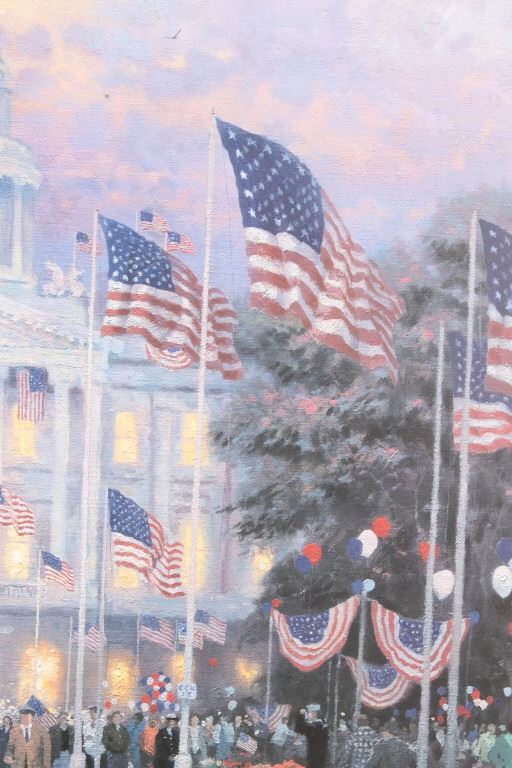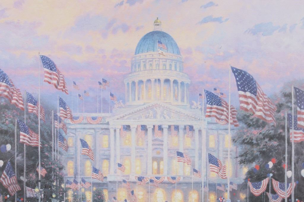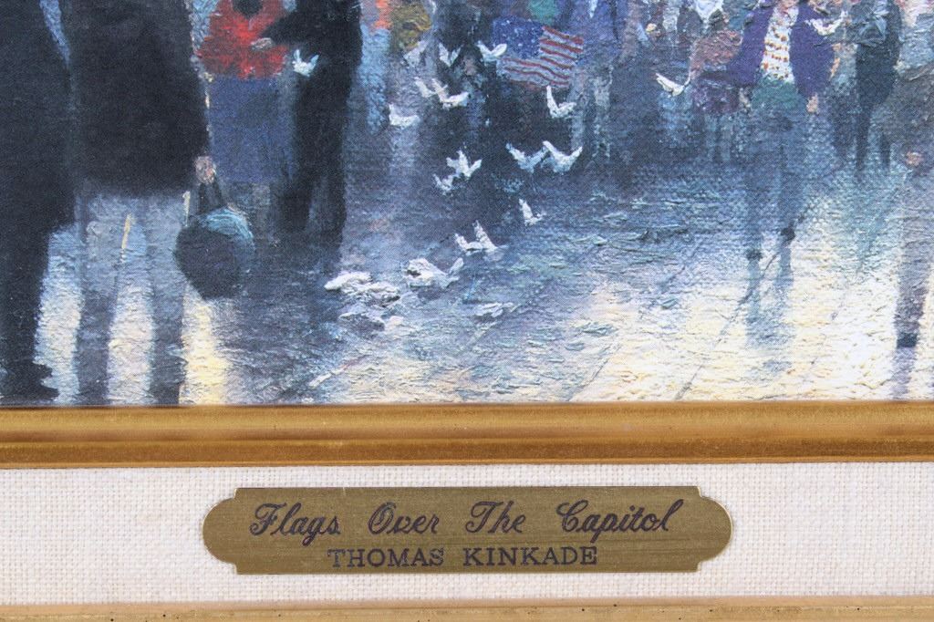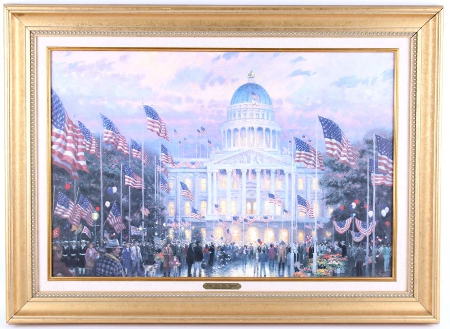 For your consideration, a Thomas Kinkade (1958-2012) framed print, "Flags Over the Capitol". Kinkade was an American artist who was born in 1958 in Sacramento, CA. He is known for his popular realistic, pastoral, idyllic paintings. "Painter of light" is a phrase he used to characterize himself--in fact, he trademarked it. "Flags Over The Capitol" was painted by Kinkaid in 1991; according to the Kindade Sudios website, the painting "[was his] tribute to the American Spirit". The painting shows patriotic display of American flags, banners, and buntings unfurled and waving in the breeze in front of the United States Capitol building. The print is framed in a gilt wood frame and has a brass title plate on the mat. Excellent condition; measures 33 1/2" x 24 1/2".