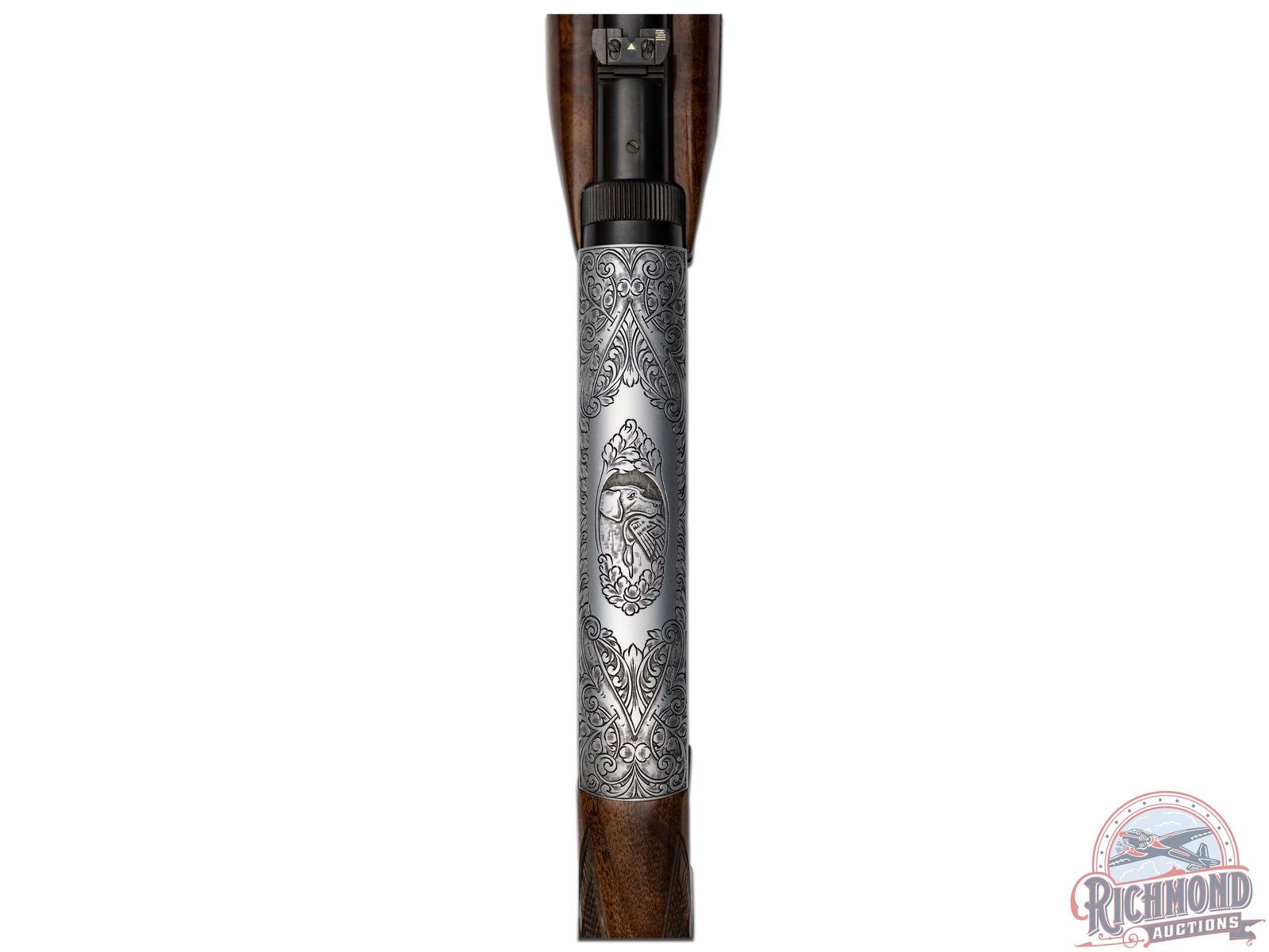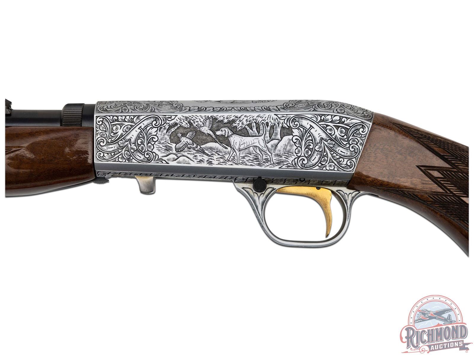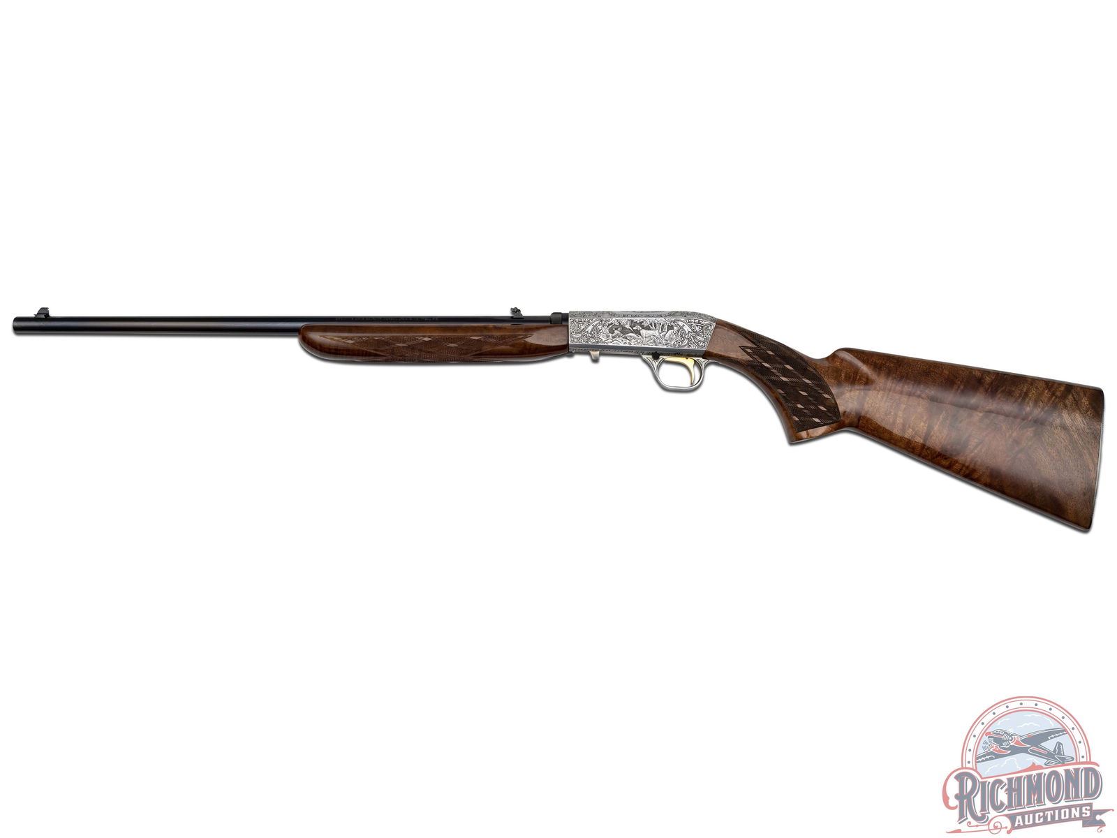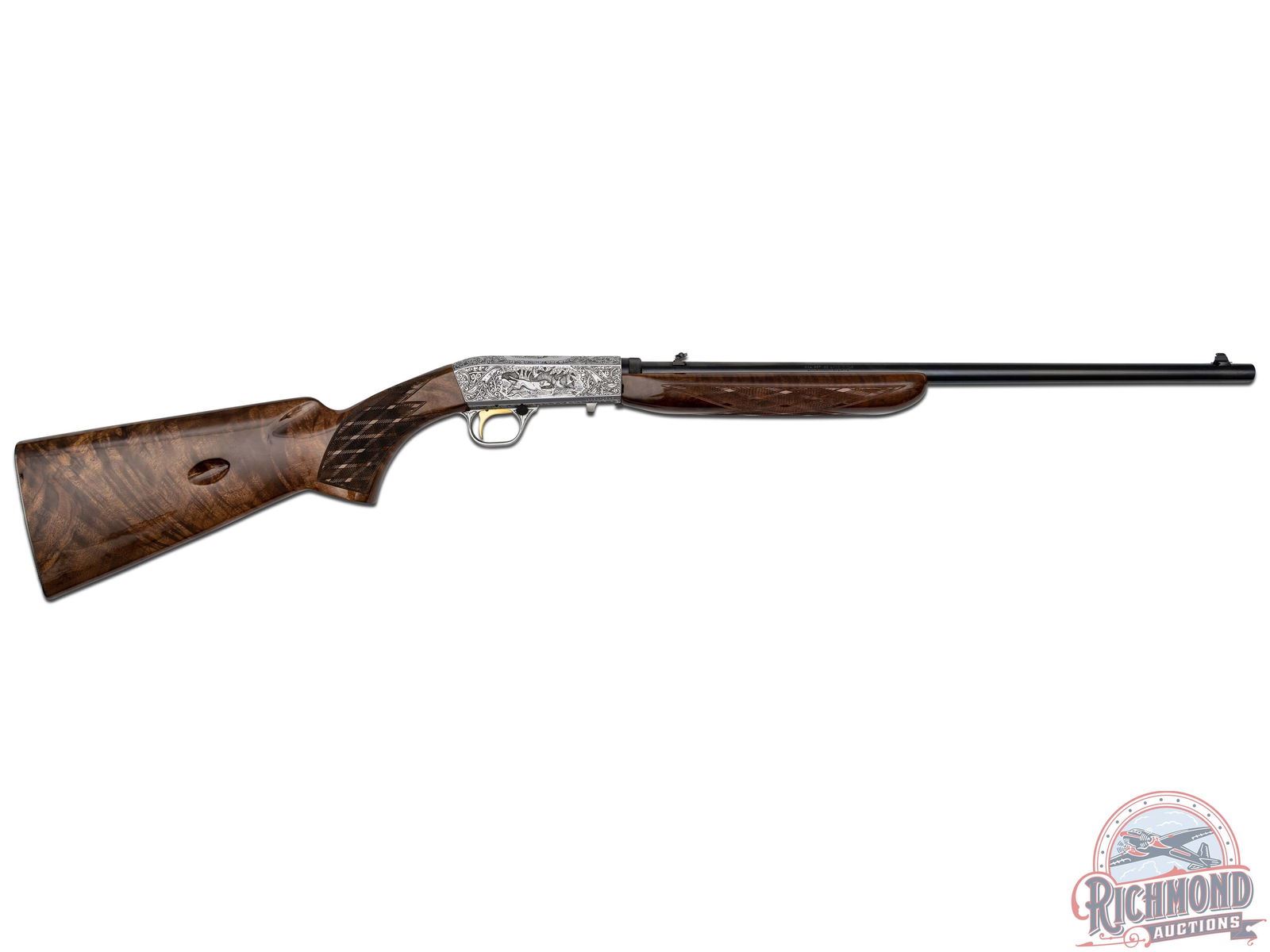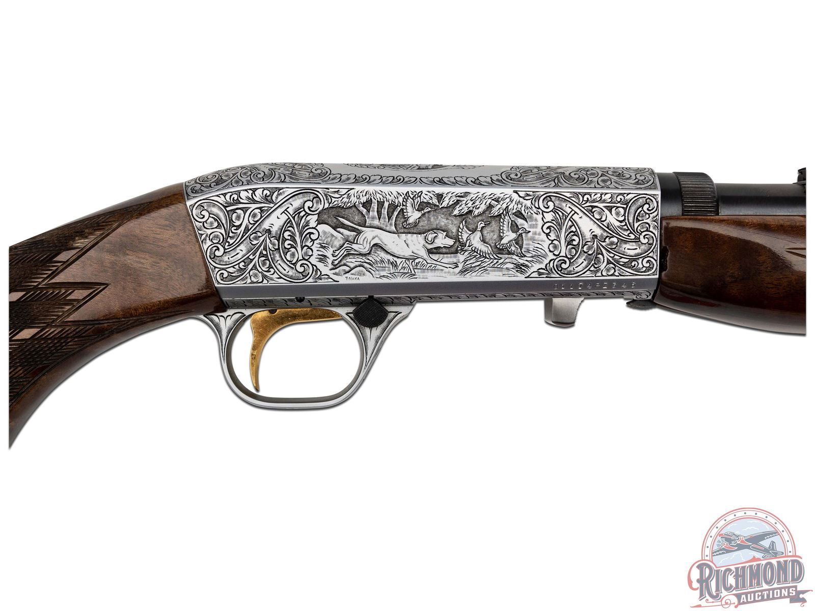 Manufactured in 1981. Blued round 19-3/8" barrel with standard factory drilled scope mount holes. grayed takedown, heavy chisel engraved receiver with dog and bird scene signed "T. Naka". Gold platted trigger with push button safety and tubular magazine. Walnut figured skip-line checkered two piece stock with blued serrated butt plate. CALIBER: 22 LR. S/N: 01174PZ346. FFL STATUS: Modern.