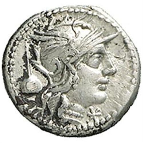 T. Quinctius Flamininus. Denario, 126 a.C. D/ Testa di Roma a destra. Dietro, apex. Davanti, X. R/ I Dioscuri al galoppo a destra. Sotto i cavalli, scudo macedone tra T e Q. In esergo: ROMA. Cr. 267/1. B. 2. gr. 3.88 AG. Bel BB+.