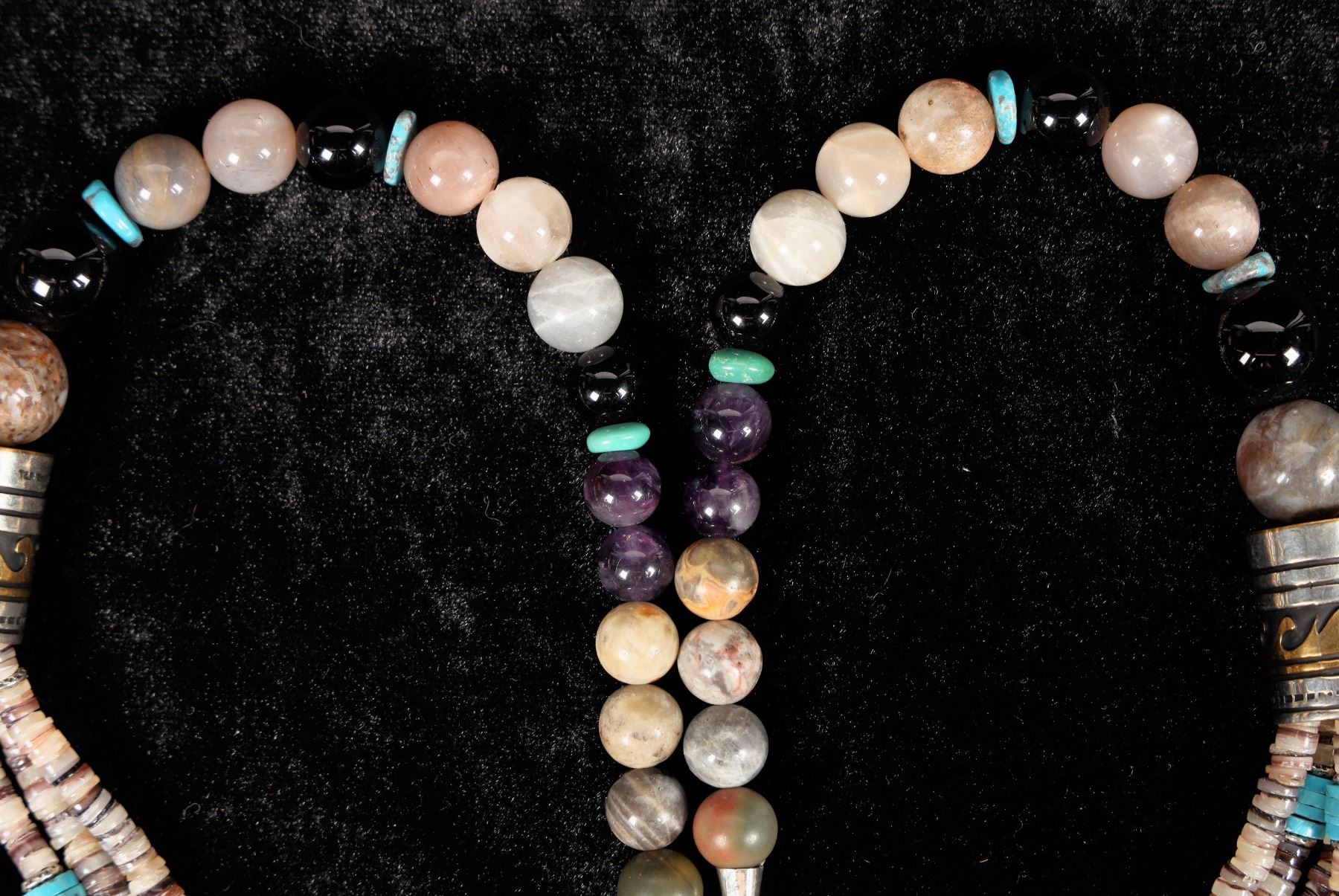 This is a T&R Singer 4 strand turquoise and multi stone bundle necklace with the Singer family hallmark sterling barrels. Top to bottom measures at about 14", a great piece for dressing up or dressing down.