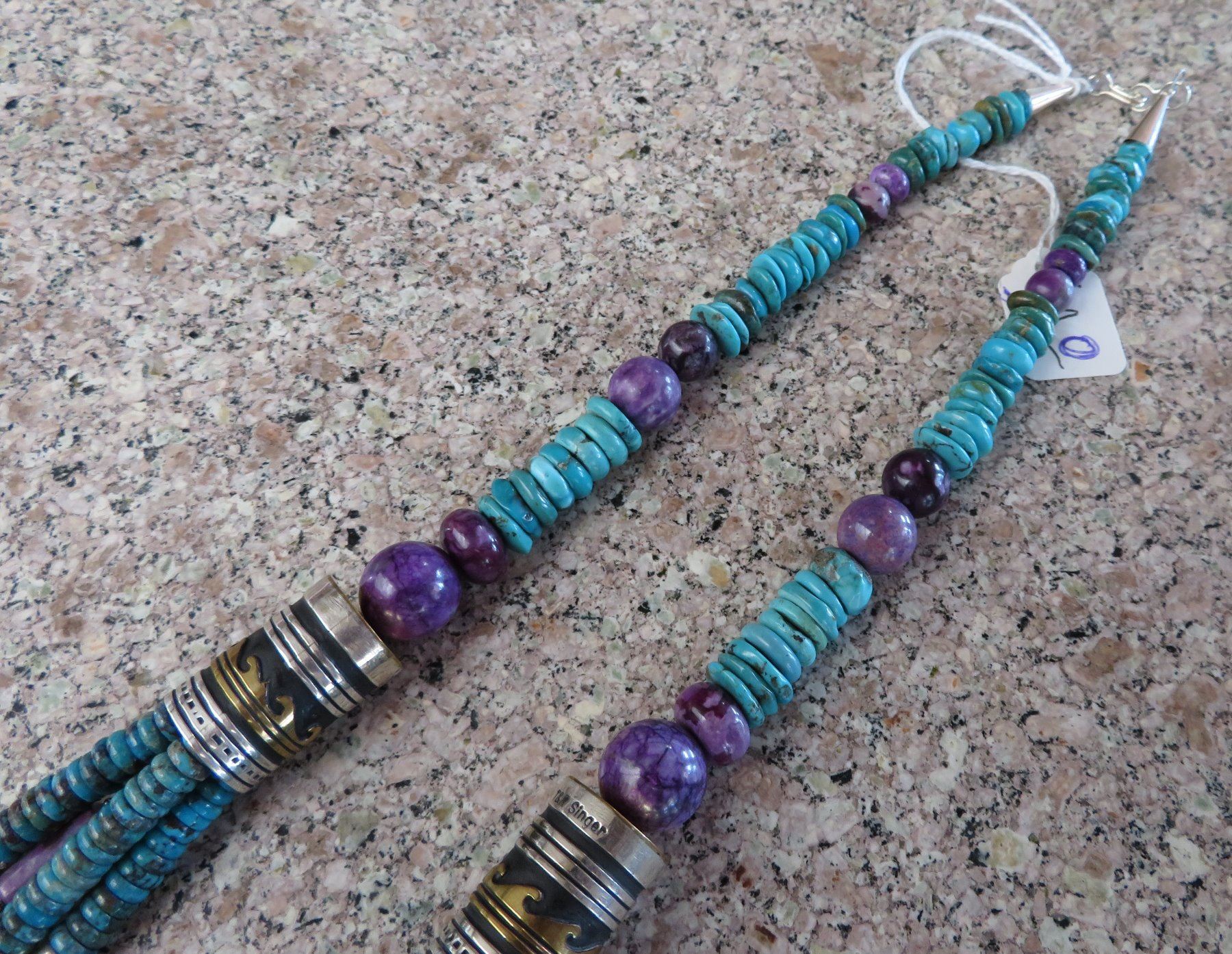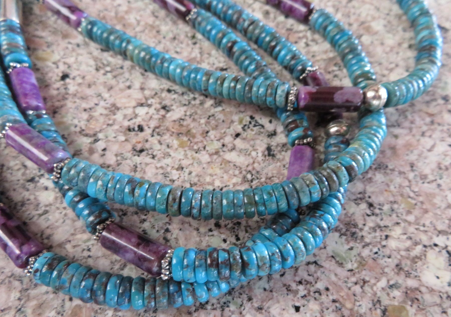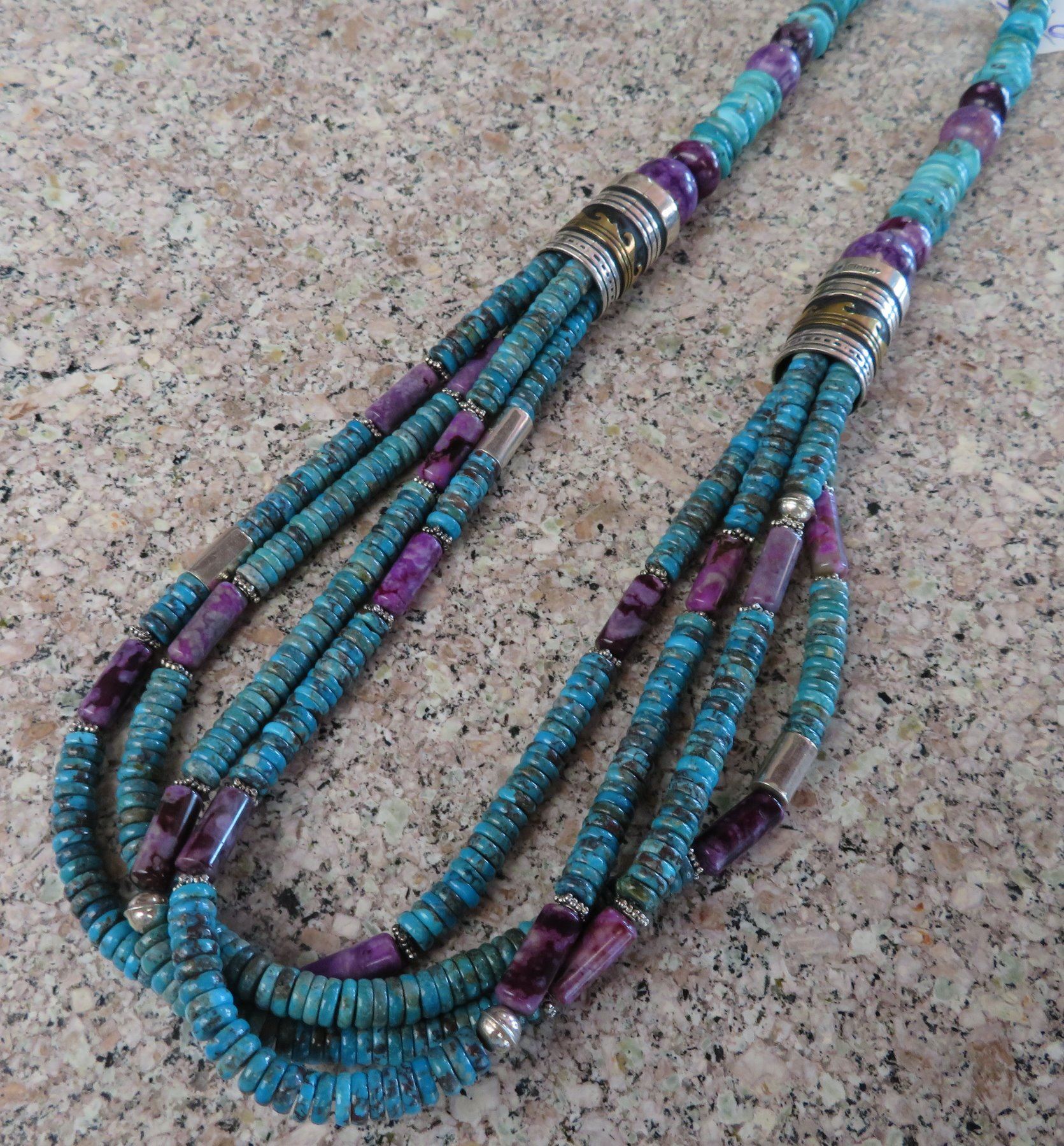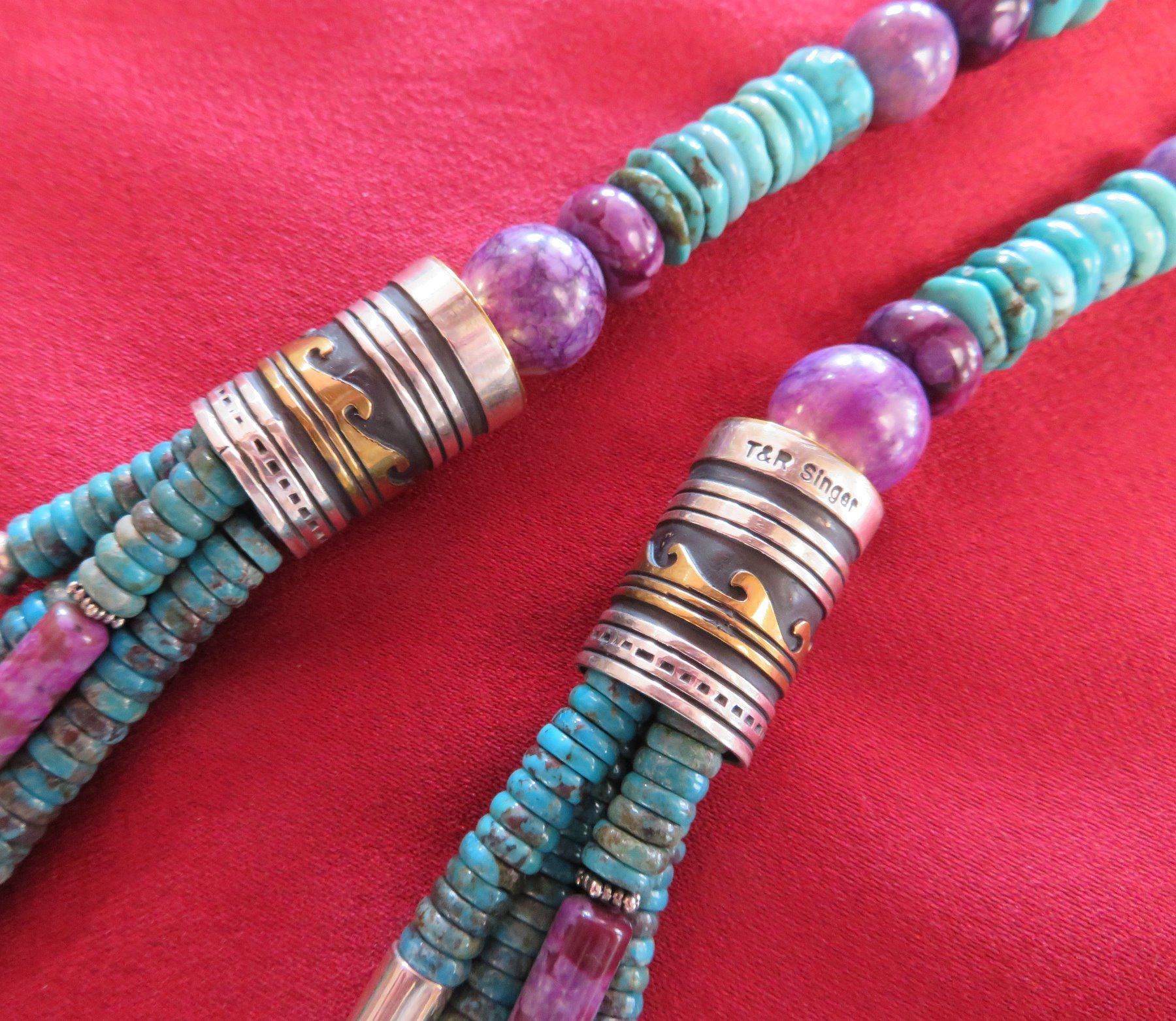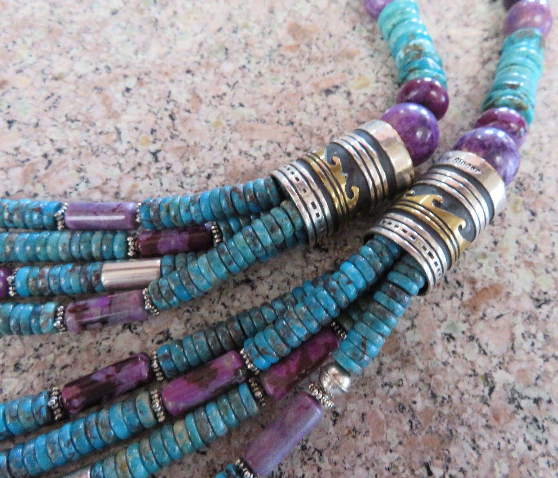 T & R Singer Turquoise Necklace, c. 2000s. Made of turquoise, sugelite, sterling silver and gold inlay, the item hangs 13" as worn, 28" strung out. T & R Singer, Singer Family. Various sizes and hspaes of polished stone beads. 2 strands give way to 4 smaller stranders. condition: Very good, see images. Shipping: $20.50 w/insurance and signature, due to value.