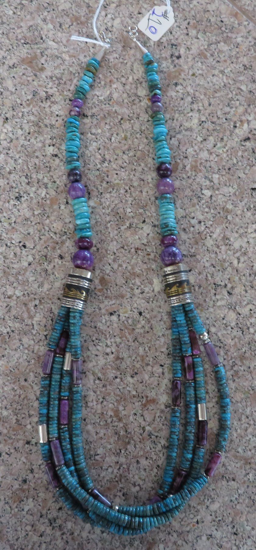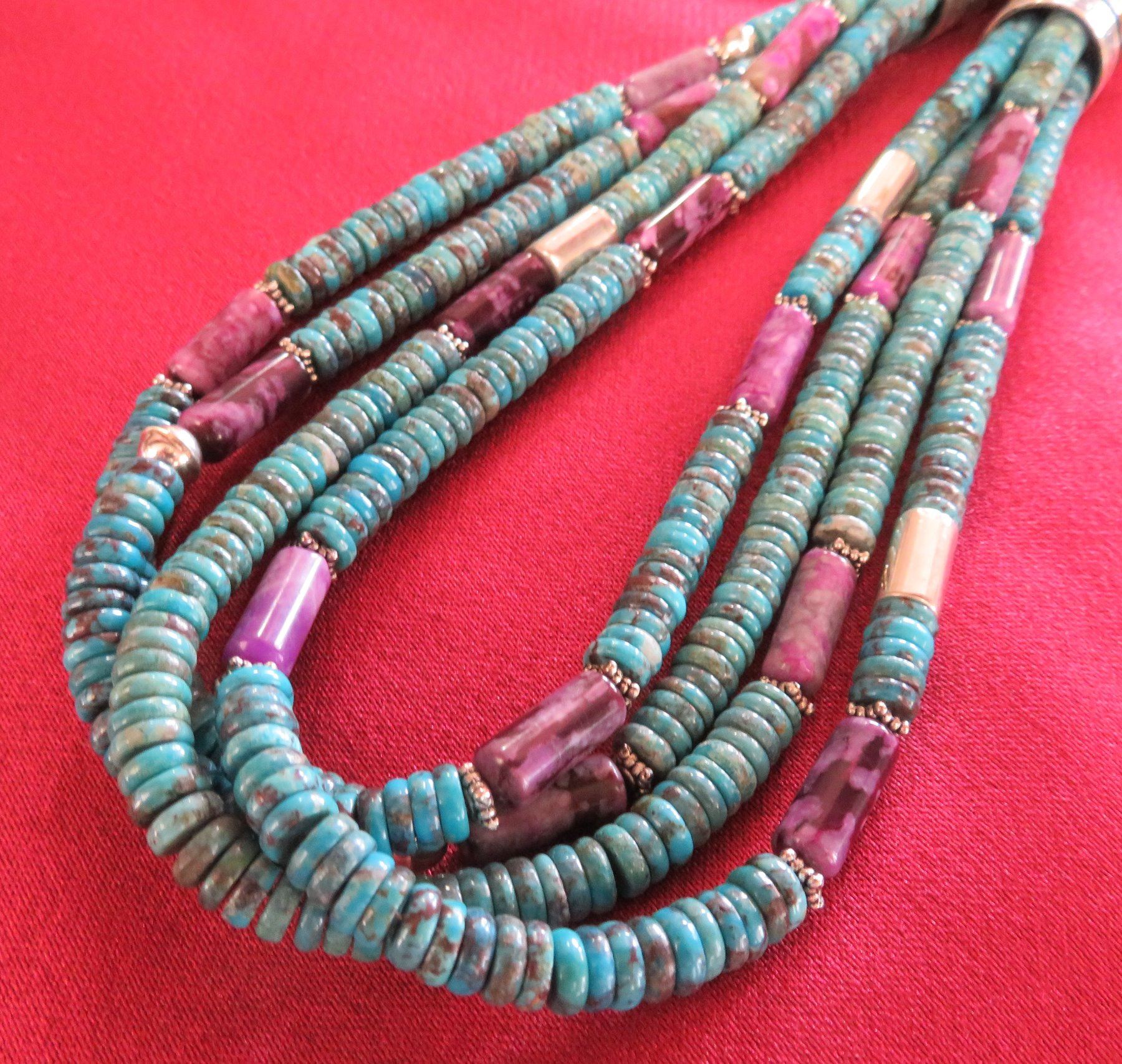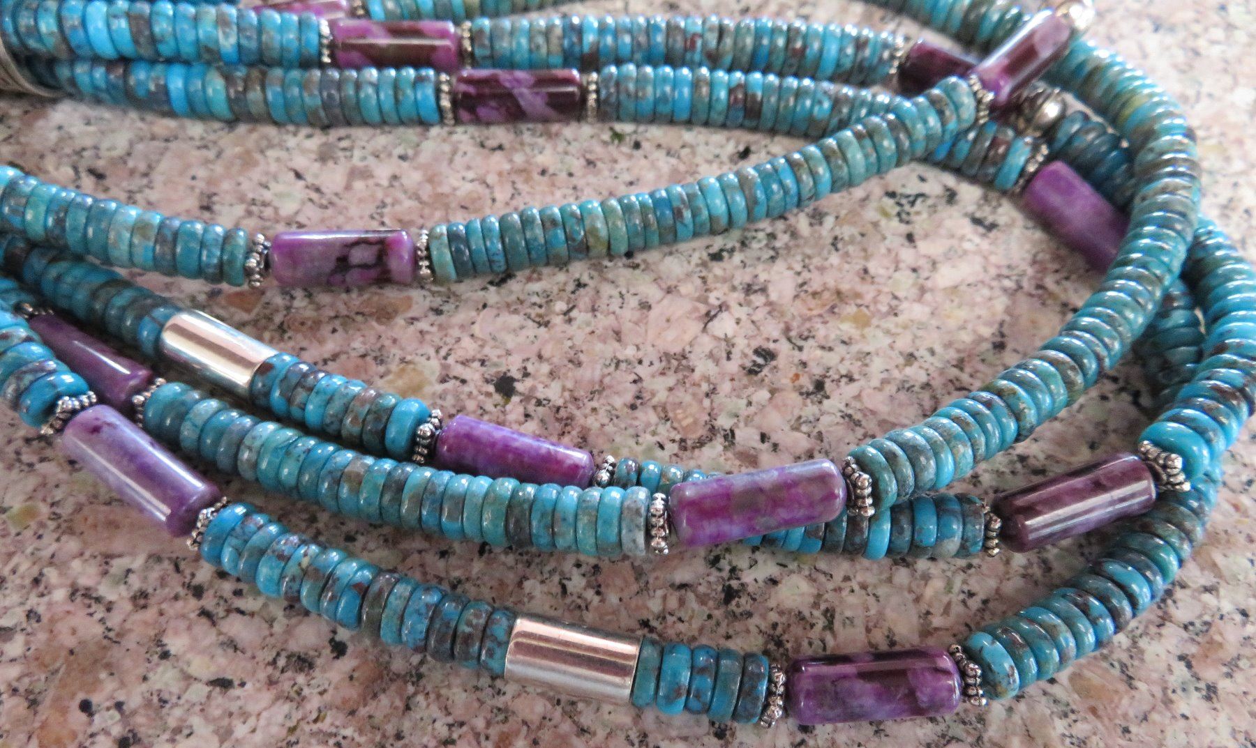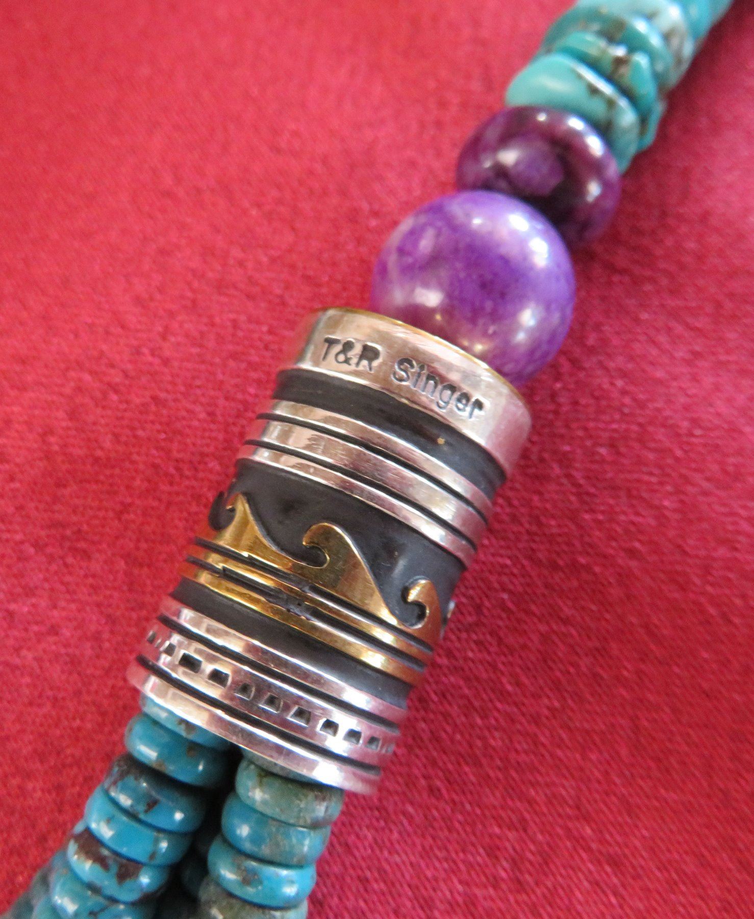 T & R Singer Turquoise Necklace, c. 2000s. Made of turquoise, sugelite, sterling silver and gold inlay, the item hangs 13" as worn, 28" strung out. T & R Singer, Singer Family. Various sizes and hspaes of polished stone beads. 2 strands give way to 4 smaller stranders. condition: Very good, see images. Shipping: $20.50 w/insurance and signature, due to value.
