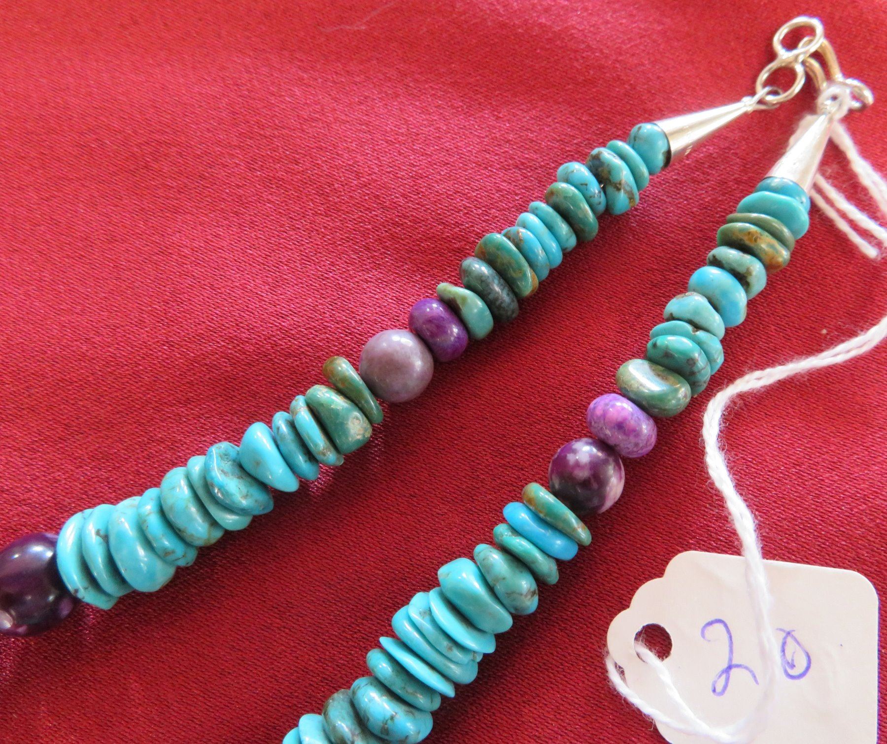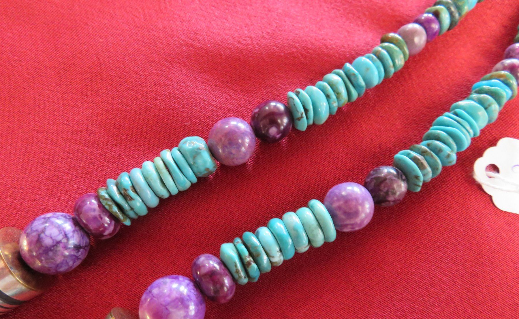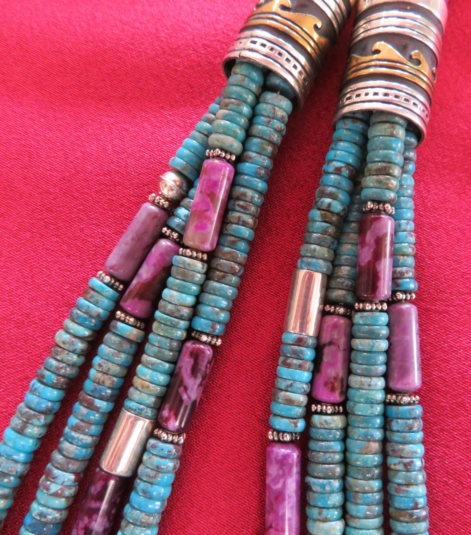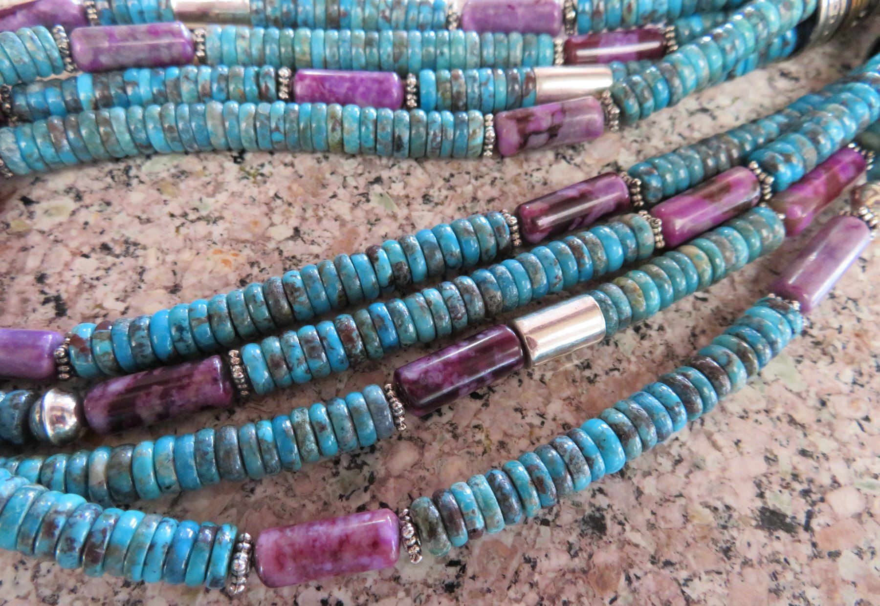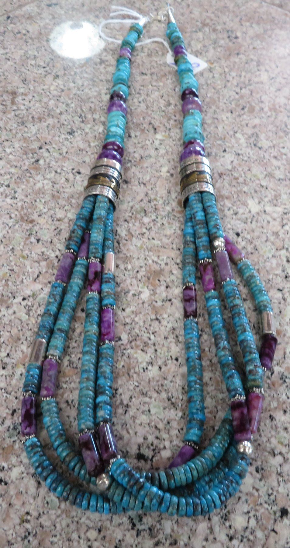 T & R Singer Turquoise Necklace, c. 2000s. Made of turquoise, sugelite, sterling silver and gold inlay, the item hangs 13" as worn, 28" strung out. T & R Singer, Singer Family. Various sizes and hspaes of polished stone beads. 2 strands give way to 4 smaller stranders. condition: Very good, see images. Shipping: $20.50 w/insurance and signature, due to value.