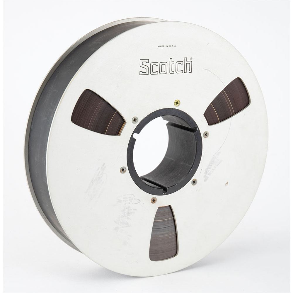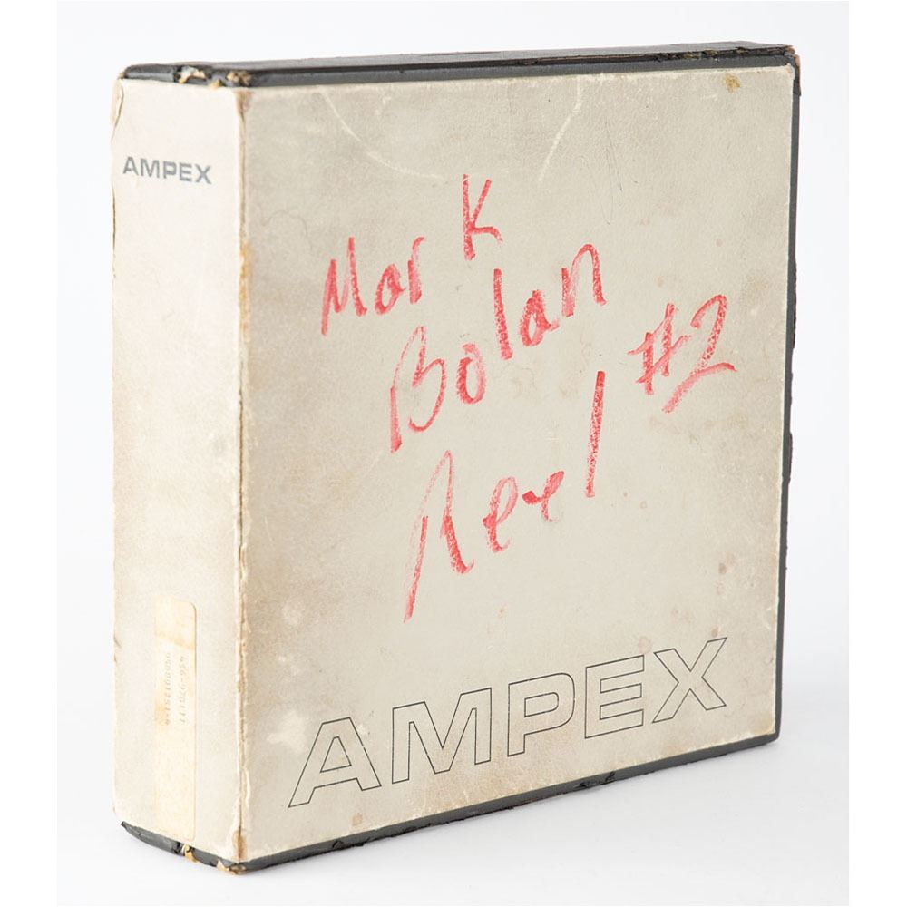 Lost 10.5Ë Ampex Scotch reel-to-reel master tape featuring music by Marc Bolan and his girlfriend Gloria Jones, with both sides of the metal reel stamped "Secret." The tape contains 16 tracks and over 3-and-a-half hours of music, including four versions—two demos and two final take versions—of the unreleased T. Rex song ‘Over You Babe.' The balance of the tape contains instrument samples for bass, piano, guitar, and drums, as well as some vocal demos by Bolan, Jones, and an unidentified singer. The tape’s contents have been transferred to a 16GB USB flash drive, which is included with the lot, as is the original Ampex box marked on the top, “Mark [sic] Bolan, Reel #2,†and the original studio production sheet, which is marked “Marc Bolan, Reel 2,†along the top, and lists tracking steps for “Over You.†A particularly notable moment occurs on track No. 9, a full test run of ‘Over You Babe’ sung by Bolan and Jones with drums and guitar; at 3:40 in, Bolan errantly sings ‘My nose was a toad,' and, realizing his mistake, begins to laugh loudly. In overall fine, working condition; this tape has been professionally restored for decades of safe storage. Accompanied by a bill of payment from Audio Restored, which lists its transfer to the USB memory stick, “2 hours of manual restoration (pitch correction of take 2), production of rough stereo mixes of all four songs,†and a “bake/digitize 2Ë x 16-track studio master.â€