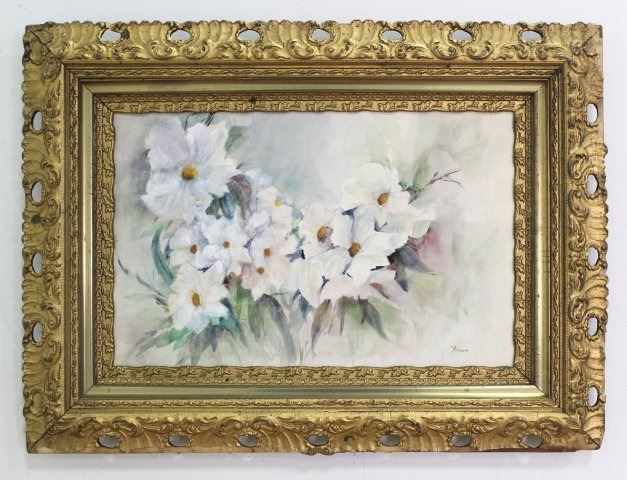 Pastel. Gilded frame. Signed lower right. Approx. 14" H x 22" W image, 22 1/2" H x 30 1/2" W framed. Some losses to frame.