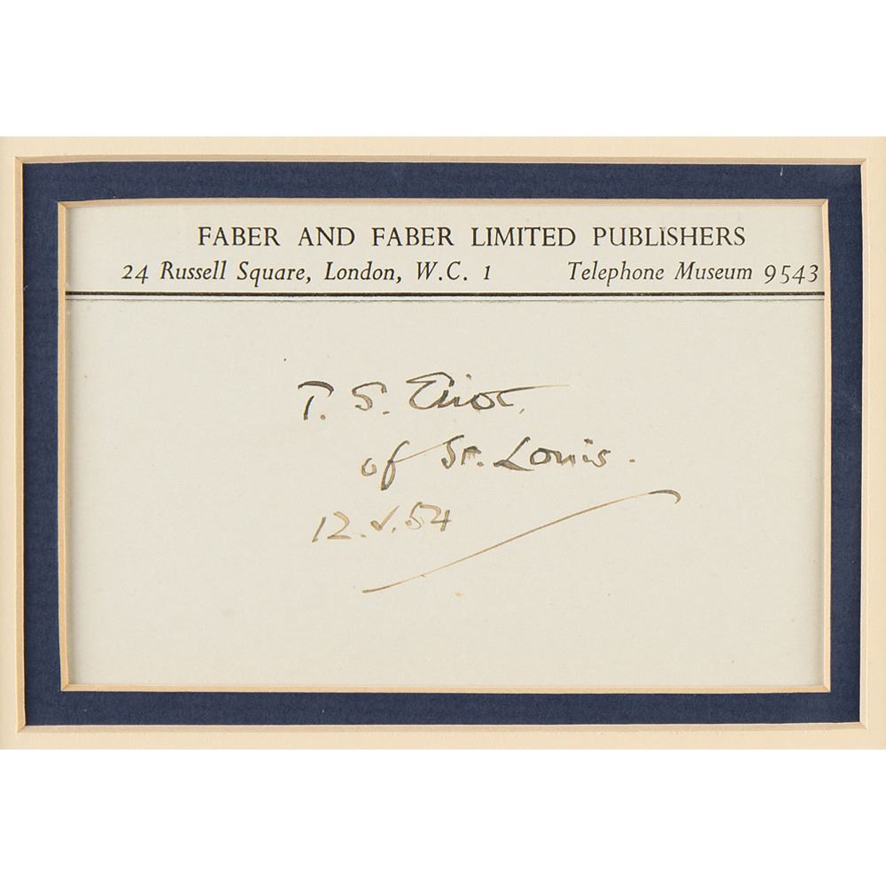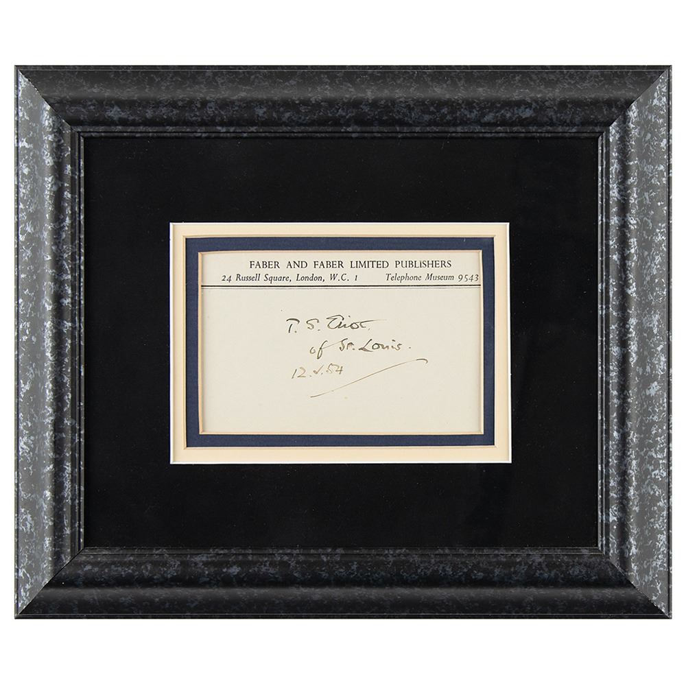 Vintage fountain pen signature, "T. S. Eliot of St. Louis, 12.V.54,” on an off-white 5 x 3 Faber and Faber card. Triple-matted and framed to an overall size of 11.5 x 9.5. In fine condition. A highly unusual autograph from the esteemed poet and essayist who, though born in St. Louis, became a British citizen and renounced his American citizenship in 1927.