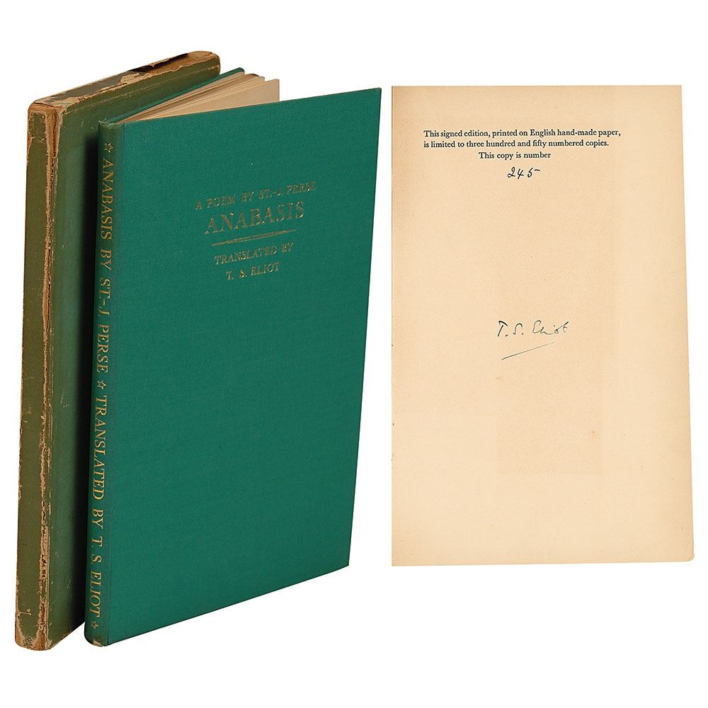Signed book: Anabasis. First edition, limited issue, numbered 245/350. London: Faber and Faber, 1930. Hardcover with slipcase, 6.5 x 10.25, 75 pages. Signed on the colophon in fountain pen, "T. S. Eliot." Autographic condition: very good to fine, with some faint irregular toning to the signed page. Book condition: VG/None in a G+ slipcase, with a small chip to cloth at spine tail, some mild foxing to textblock, and heavy wear and chipping to slipcase edges.