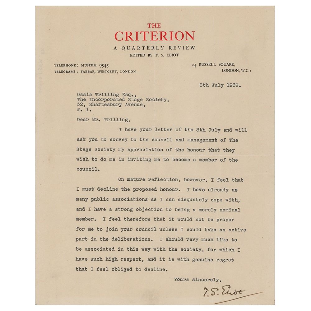Early TLS, one page, 8 x 10, The Criterion letterhead, July 8, 1938. Letter to renowned theater critic Joshua Ossia Trilling (1913-1994) of the Incorporated Stage Society, responding to their selection of him as a member, in part: “On mature reflection…I must decline the proposed honour. I have already as many public associations as I can adequately cope with and I gave a strong objection to being a merely nominal member." In fine condition. Eliot founded and edited the influential literary journal The Criterion, which provided a forum for many prominent contemporary writers. The journal did not attain financial stability until 1928 when it was steadily issued until 1939.