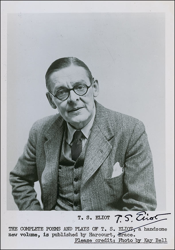 Vintage glossy 5 x 7.25 photo of the author that appeared on the cover of the New York Herald Tribune Book Review, signed in black ink. In fine condition, with some scattered light surface marks and creases. Accompanied by a 1953 TLS from Eliot’s publisher acknowledging the photo.