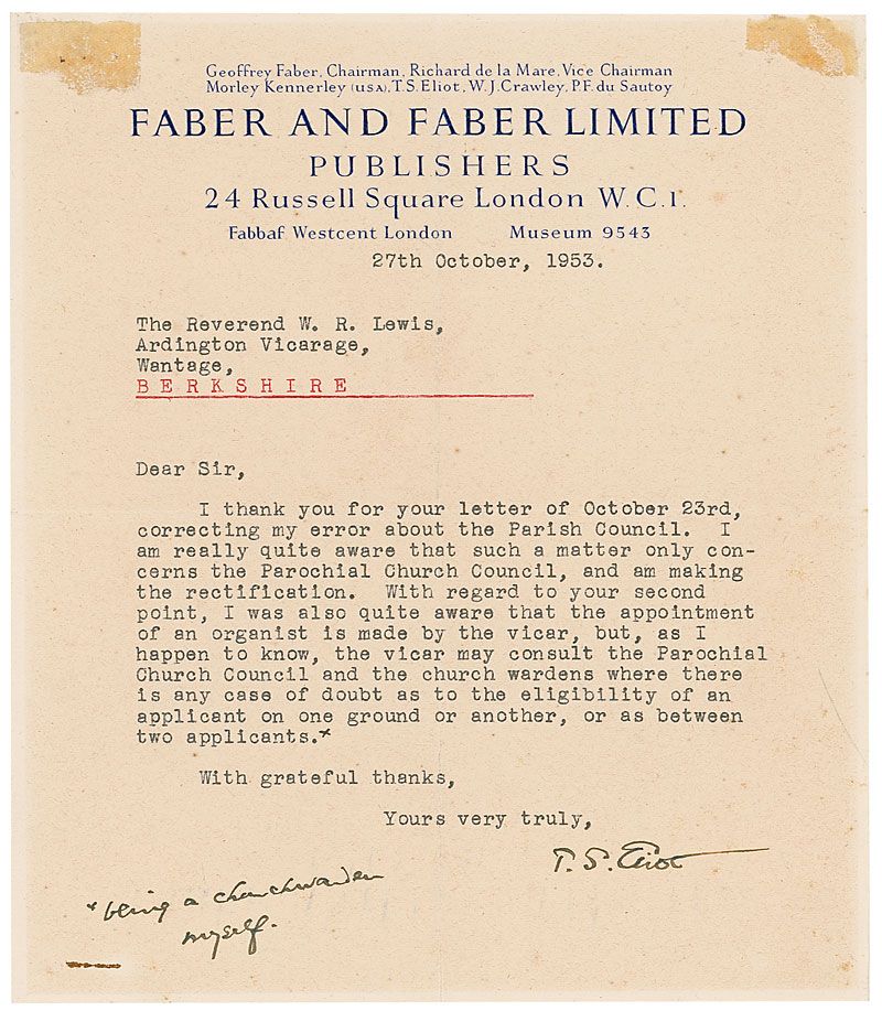 TLS, one page, 7 x 8, Faber and Faber Limited letterhead, October 27, 1953. Letter to the reverend W. R. Lewis. In part: “I thank you for your letter…correcting my error about the Parish Council. I am really quite aware that such a matter only concerns the Parochial Church Council, and am making the rectification. I was also quite aware that the appointment of an organist is made by the vicar, but, as I happen to know, the vicar may consult the Parochial Church Council and the churchwardens where there is any case of doubt.” In the lower left corner Eliot goes on to add in his hand, “being a church warden myself.” In very good condition, with uniform toning from previous display, toning to top corners from old tape on reverse, some scattered light foxing, and a central horizontal and vertical fold.