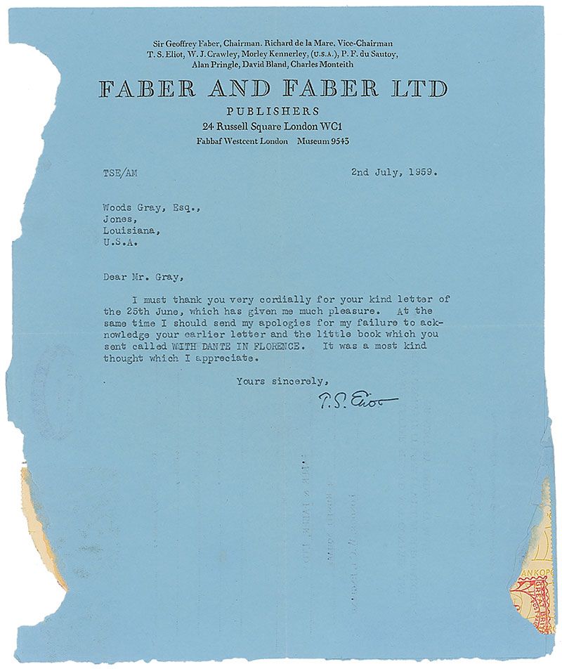 TLS, one page, 7.5 x 9.25, Faber and Faber letterhead, July 2, 1959. Letter to an admirer. In part: “I should send my apologies for my failure to acknowledge your earlier letter and the little book which you sent called With Dante in Florence.” In very good condition, with central vertical and horizontal folds and paper loss to the left border.