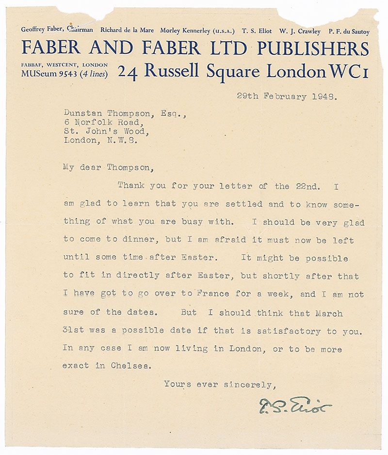 TLS, one page, 7 x 8, Faber and Faber Ltd Publishers letterhead, February 29, 1948. Letter to Dunstan Thompson, Esquire in London. In part: “I should be very glad to come to dinner, but I am afraid it must now be left until some time after Easter. It might be possible to fit in directly after Easter, but shortly after that I have got to go over to France for a week, and I am not sure of the dates. But I should think that March 31st was a possible date if that is satisfactory to you. In any case I am now living in London, or to be more exact in Chelsea.” Small tears and paper loss to top edge and intersecting mailing folds, otherwise fine condition.