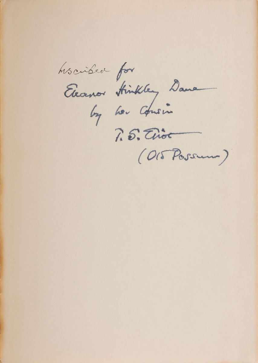 Signed book: Old Possum’s Book of Practical Cats. Later printing. NY: Harcourt, Brace and Company, 1939. Hardcover, 8.75 x 6.25, 46 pages. Signed and inscribed on the first free end page in fountain pen, “Inscribed for Eleanor Hinkley Dana, by her cousin, T. S. Eliot (Old Possum).” Autographic condition: fine, with light feathering to the ink. Book condition: VG-/None.