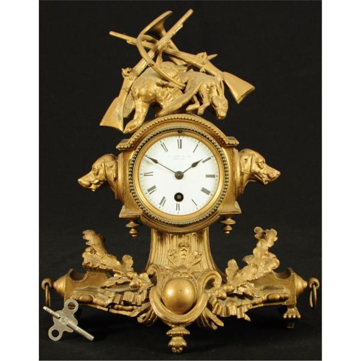 Clock face is signed T. Steele & Son Harford. Ornate Hunt Scene Mantle Clock, With Key. 11" wide x 5" deep x 12 1/2" tall.