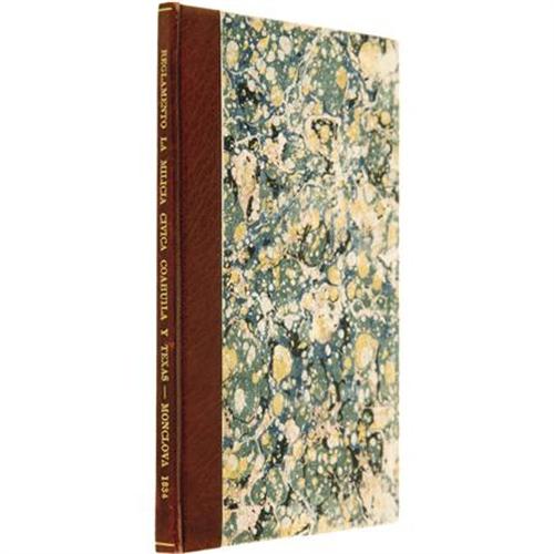 <B>Reglamento Para La Milicia Civica Del Estado De Coahuila Y Texas. Monclova 1834 [Regulations for the Civic Militia of the States of Coahuila and Texas. Monclova 1834]</B></I> Government printing directed by the citizen Sisto Gonzales: 1834 [May 6, 1834], 12mo., 21 pp., with ornamental border on title page. <B>Thomas Streeter's</B></I> copy, containing his personal bookplate on the front pastedown. The Reglamento contains regulations for the establishment of the civil militia, in 9 chapters, 86 articles. It outlines the chain of command, and covers such details as uniforms, salary, ranks, and armament. Entered in Kimball's <I>Laws Of Coahuila and Texas</B></I> only by title, it follows the same general arrangement as the earlier Reglamento on the civic militia of 1828 (Streeter 731), which it supersedes, and many of the articles are the same. Ironically, the military unit established by these regulations would be involved in the earliest uprisings under Juan Seguin, and would eventually participate in the revolution against Santa Anna. Bound in quarter Morocco with marbled paper, gilt title along spine. Minor staining at bottom throughout. <I>From the collection of Darrel Brown.</B></I><BR><BR><B>Reference: </B></I>Streeter 809: locating only two additional copies. Streeter's copy with bookplate<BR><BR><b>Shipping:</b> Books & Catalogs (<a target="_blank" href="http://www.heritageauctions.com/common/shipping.php">view shipping information</a>)