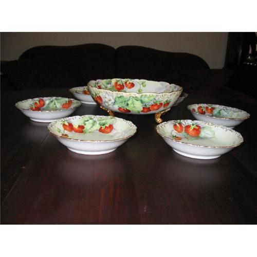 STUNNING SEVEN PIECE HAND PAINTED T & V LIMOGES BERRY BOWL SET. THIS SET, WHICH APPEARS TO NEVER HAVE BEEN USED, FEATURES BEAUTIFULLY PAINTED STRAWBERRIES WITH LEAVES AGAINST A CREAMY BACKGROUND. THE BOWL 8.25" IN DIAMETER AND 3" HIGH AND IS FOOTED WITH LOVELY GOLD GILDING. THE SMALLER BOWLS ARE 5.50" IN DIAMETER. THE ONLY IMPERFECTION IS ON THE UNDERSIDE RIM OF ONE SMALL BOWLS AND MAY BE A SMALL CHIP OR MANUFACTURING DEFECT. OTHERWISE, EVERYTHING IS MINT. NO CRACKS, HAIRLINES OR SCRATCHES ON ANY OF THE BOWLS. MARK IS TRESSMAN & VOGT MARK 6 IN GREEN UNDERGLAZE DATING THE SET TO 1892-1907.
