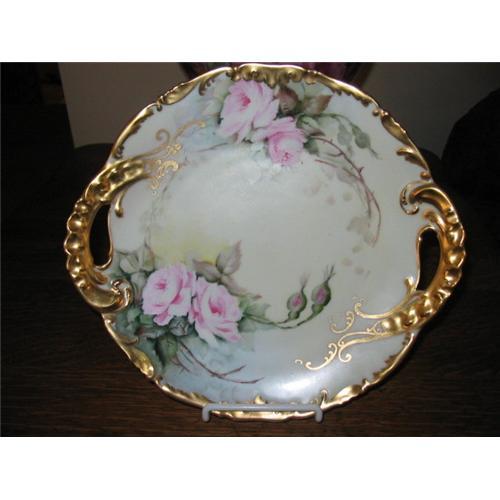HERE IS A STUNNING HAND PAINTED ARTIST SIGNED T&V LIMOGES CAKE PLATE. IT FEATURES BEAUTIFUL AND DELICATE PINK ROSES AND BUDS AND IS LAVISHLY GILDED WITH GOLD AS CAN BE SEEN IN THE IMAGES. THE ARTIST INITIALS (S.E.B.) AND DATE (12/25/07) ARE ALSO IN THE IMAGES. THIS IS CLASSIC VICTORIAN LIMOGES AT ITS FINEST. NO CHIPS CRACKS OR REPAIRS AND NO GOLDWEAR. THE PLATE MEASURES 11" IN DIAM AND THE MARK IS TRESSEMANN