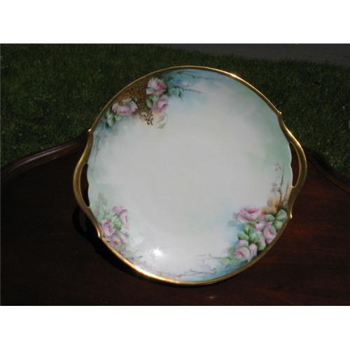 STUNNING T & V LIMOGES HAND PAINTED ARTIST SIGNED CAKE PLATE FEATURING PINK ROSES AND LAVISH GILDING. MEASURES 10.75" HANDLE TO HANDLE. EXCELLENT CONDITION WITH NO SCRATCHES CHIPS CRACKS OR HAIRLINES. GOLD IS ALL THERE AND GORGEOUS! TRESSMANN & VOGT MARK 7 IN GREEN UNDERGLAZE. ARTIST SIGNATURE: GOSS. DTD 1914.