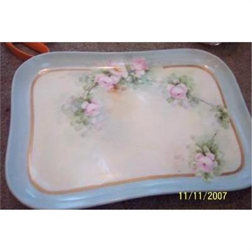 This very feminine and pretty footed dresser tray was manufactured by Tressemann & Vogt (T&V). The mark indicates that it was manufactured sometime between 1892 to 1907.<p>John Vogt (1815-1906) was born in Germany to a family of porcelain and glass retailers. In 1840 he opened an import house in New York. In the 1850s he opened an office in Limoges and soon began decorating Limoges porcelain for export. <p>His son Charles Vogt and his nephew Frederic Dose joined the New York company in 1865, and traded as Vogt & Dose, which also had a decorating studio in New York. Dose took over in 1886, succeed by Gustave Vogt, whose son Charly managed the New York operations until they were discontinued in 1931. <p>A second son, Gustave Vogt, took over the Limoges branch by 1870 and partnered with Emilien Tressemanes in the early 1880s. In 1891 they bought two small porcelain factories in Faubourg Montjovis (Limoges) and began manufacturing a very high quality whiteware for export to the USA. In 1891, the company was commissioned to produce a complete dinner service for President Harrison. <p>Tressemann retired in 1907 and Gustave Vogt became sole owner, at which time he changed the name to Porcelaine Gustave Vogt. In 1919 Martial Reynaud bought the company. He continued using the T&V mark as well as his own Reynaud mark. Reynaud porcelain remains in production to this day. <p>This tray features handpainted pastel pink roses on a tray with a soft blue border - a very soft and feminine color ...