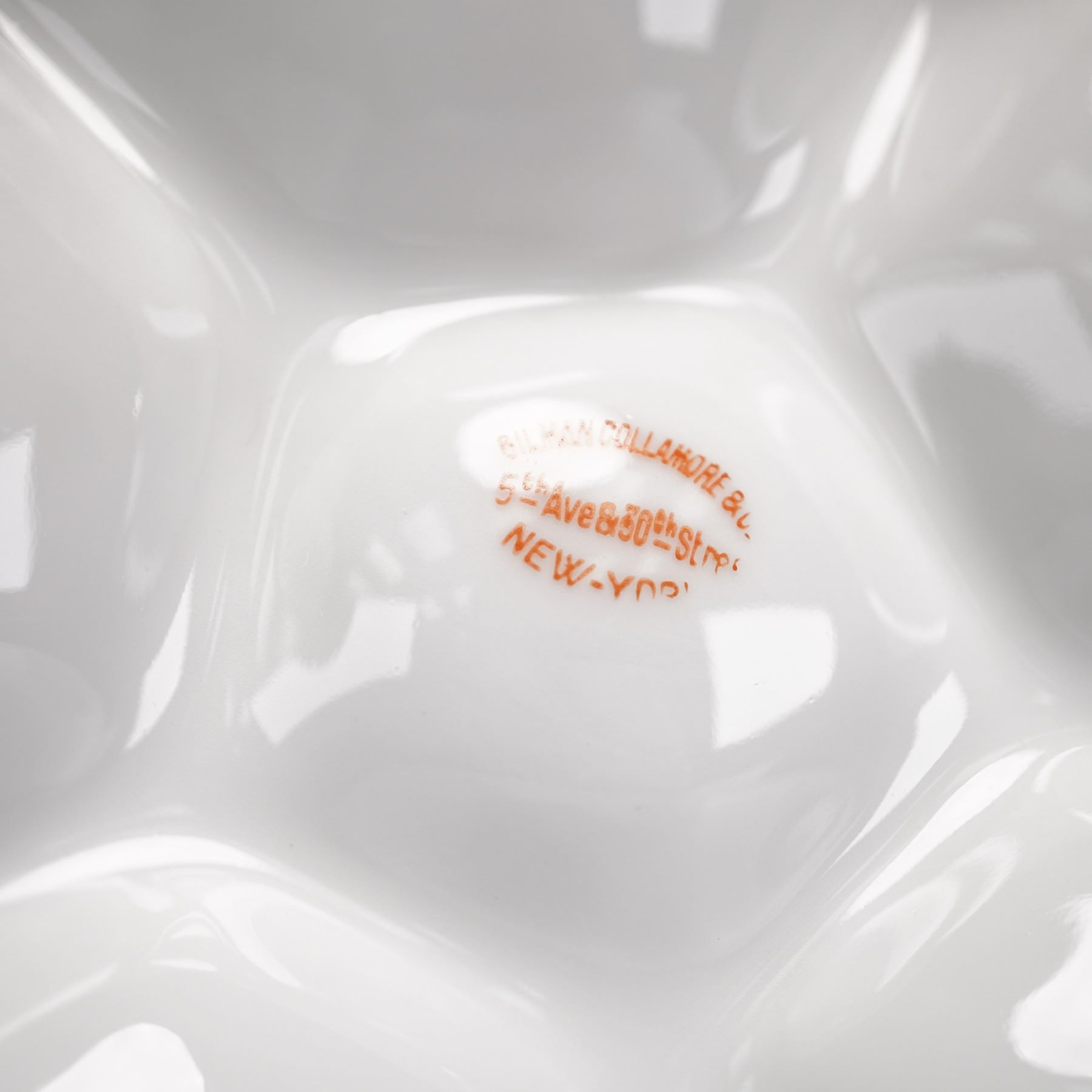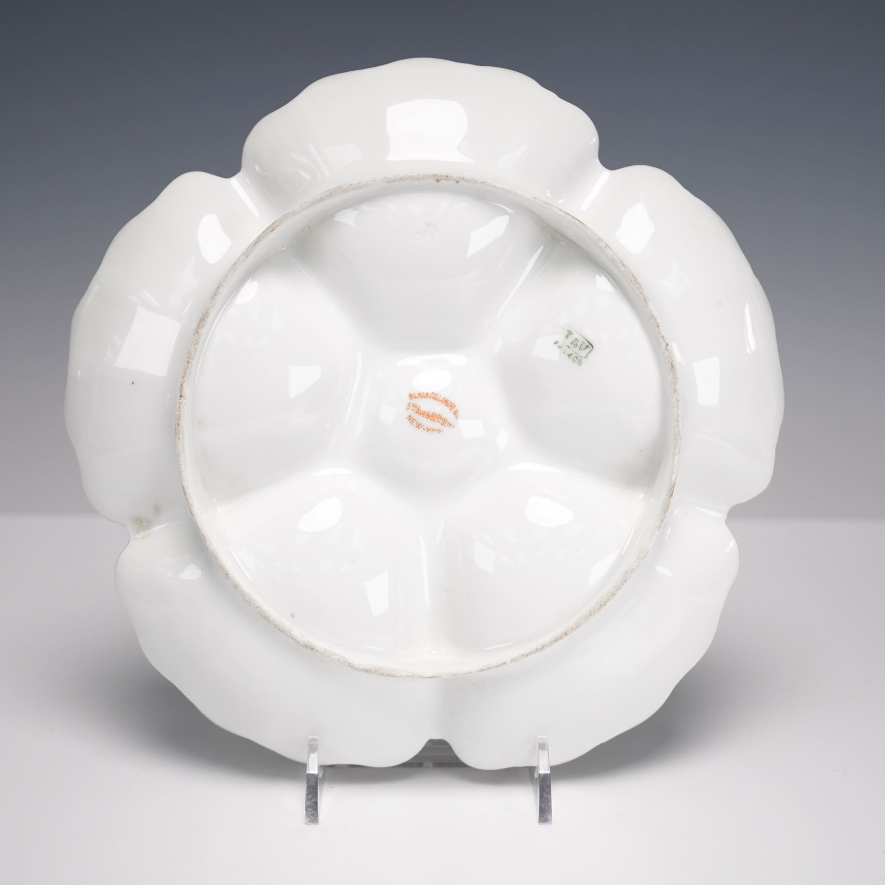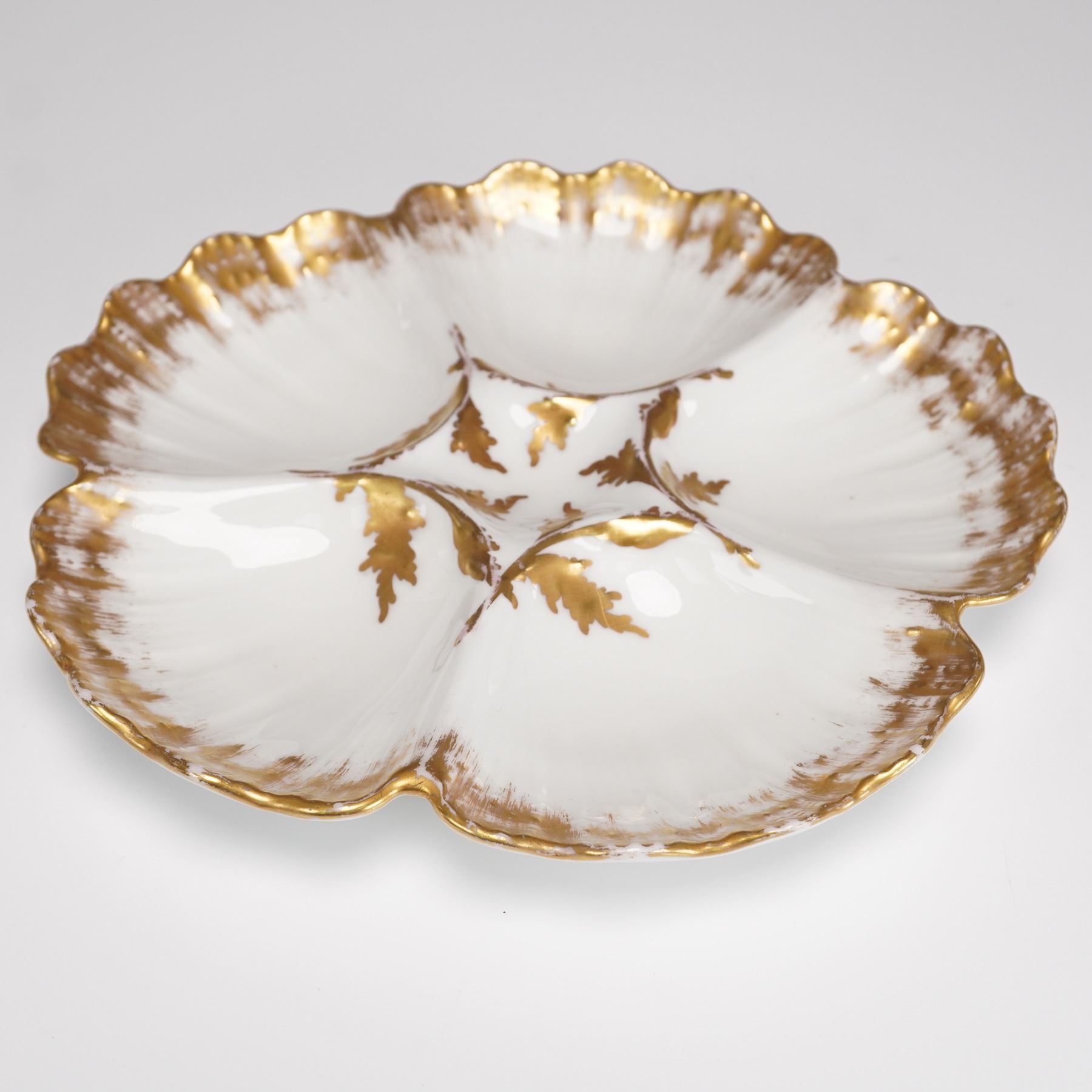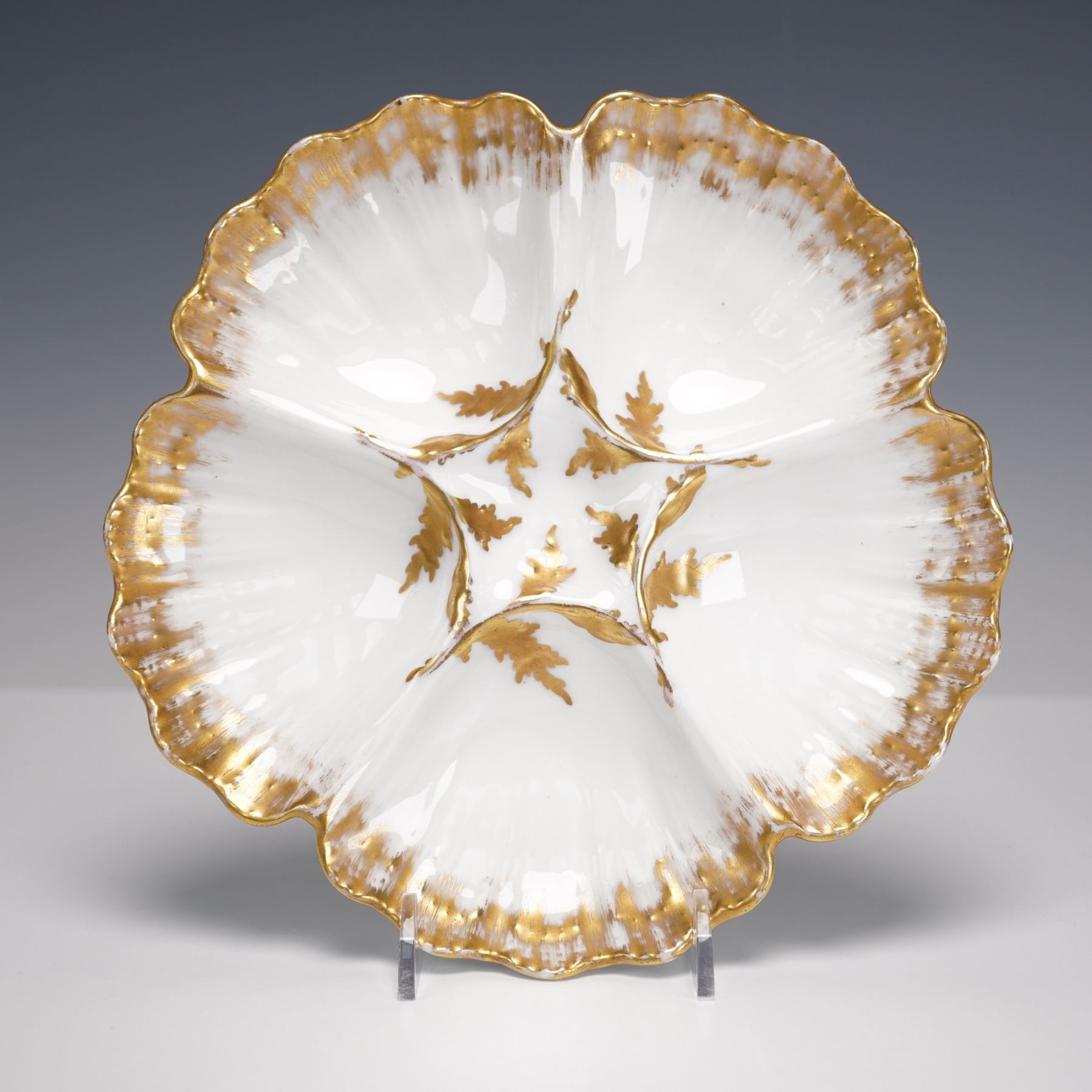 A fine French porcelain oyster plate by Tressemanes & Vogt (T&V), Limoges, circa early 20th century. The five-lobed design features a scalloped rim and molded wells, each hand-decorated with delicate gilt oak leaf motifs and wide brushed gold accents around the rim. Marked on the underside with the T&V underglaze green factory stamp and red overglaze decorator's mark.