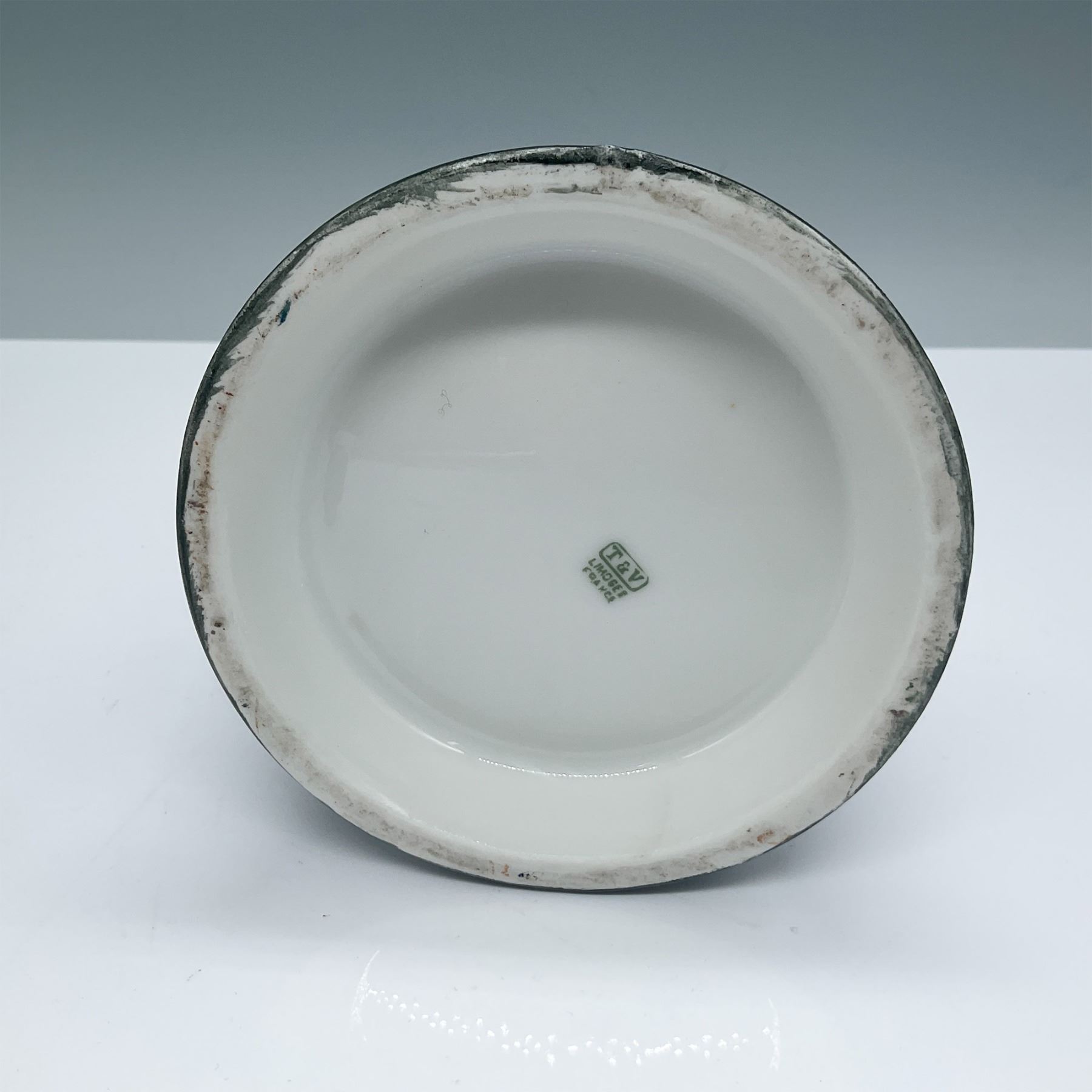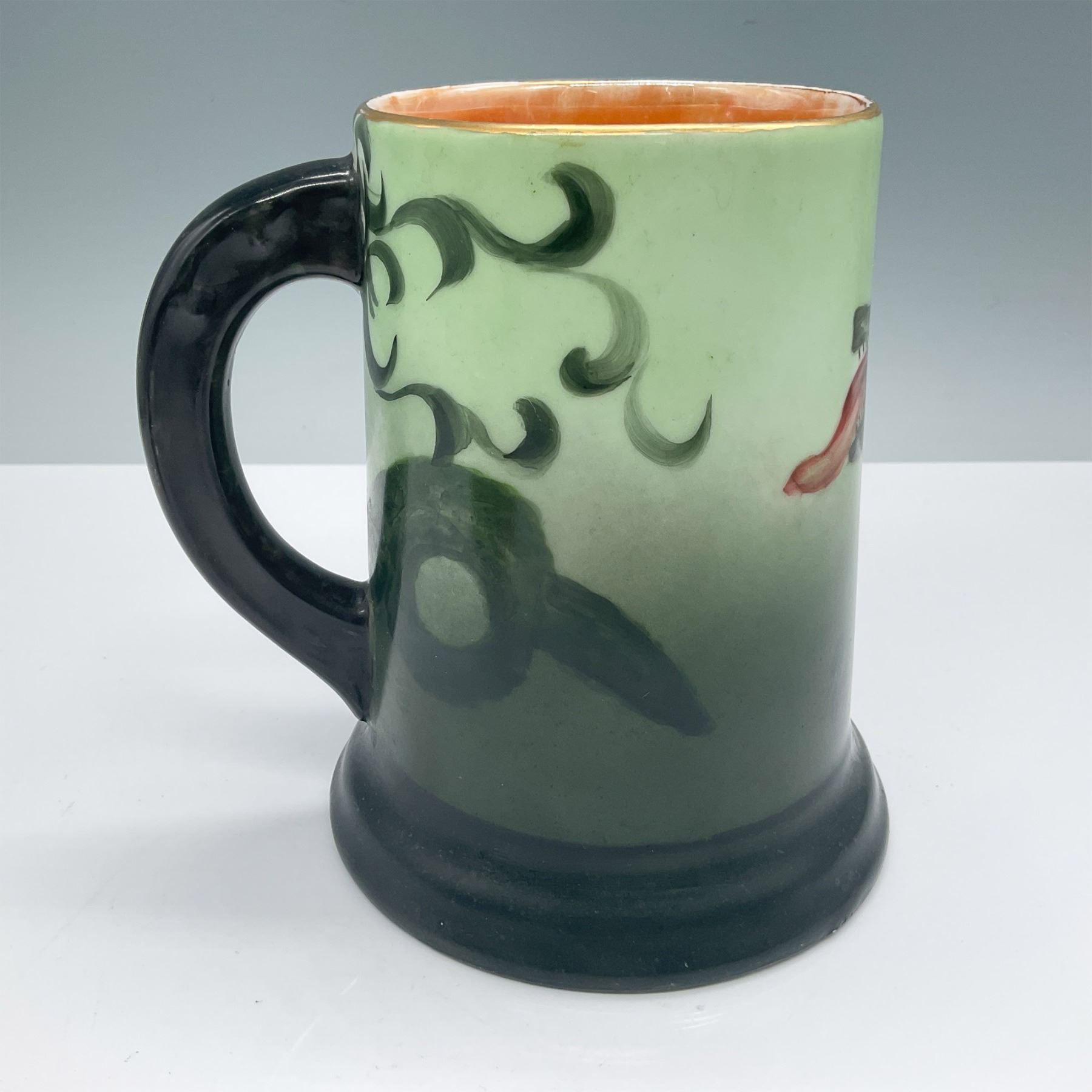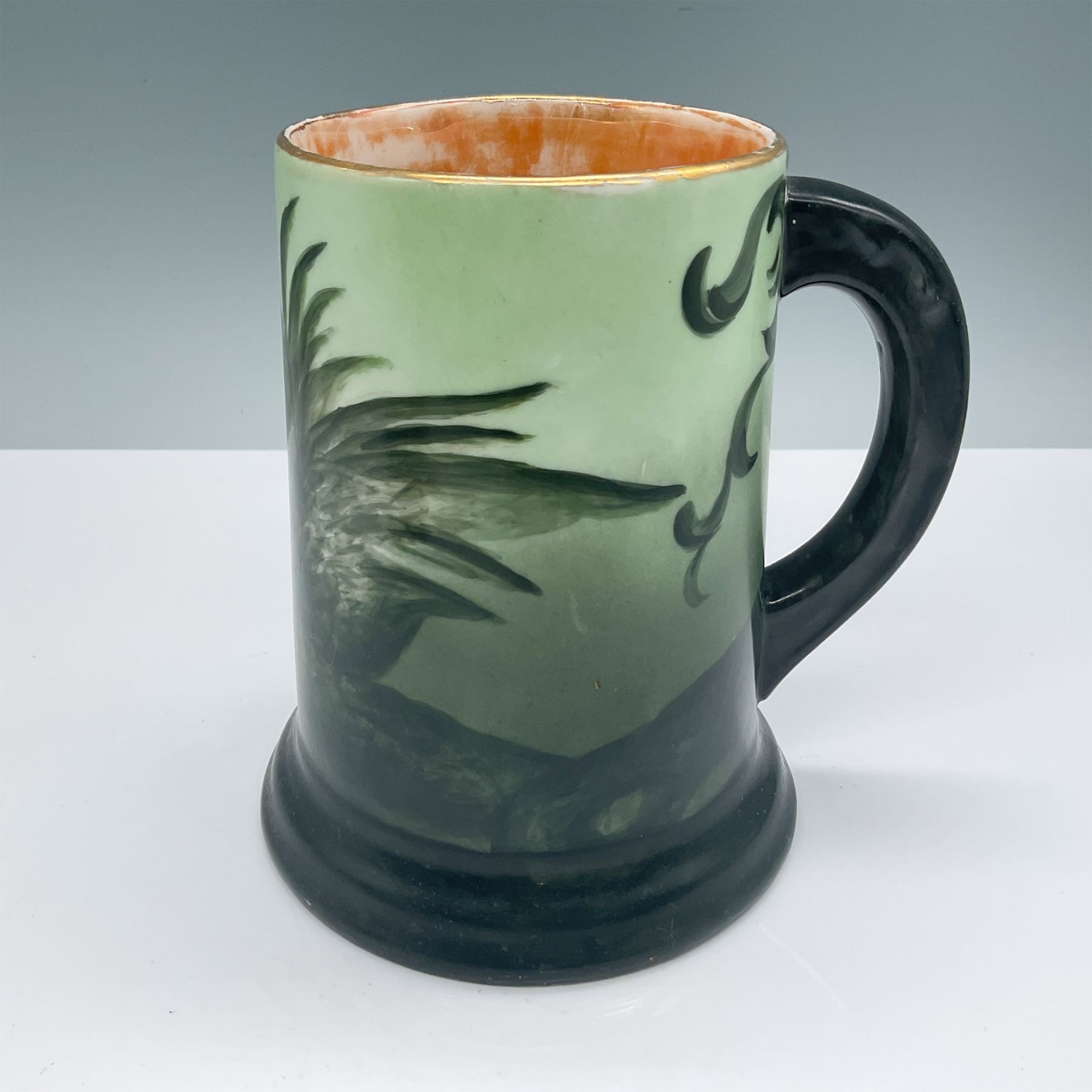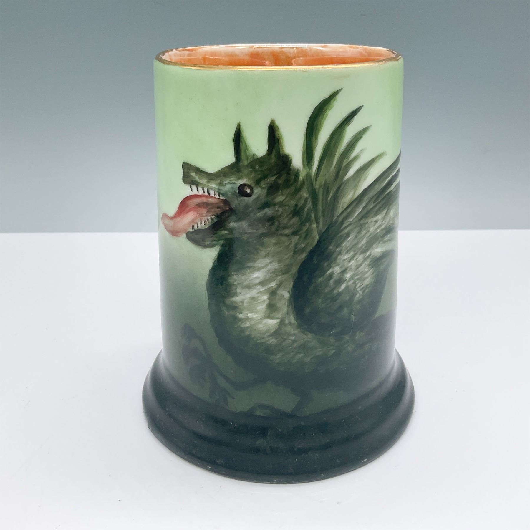 A T&V Limoges tankard mug featuring a hand-painted dragon design in vibrant green and black tones, highlighted with a red tongue and orange interior. Marked on the base with the green T&V Limoges France backstamp, indicating its origin. The detailed artwork showcases exceptional craftsmanship and intricate brushwork. Measuring 5.25"H, this collectible mug is a fine example of early 20th-century Limoges artistry.