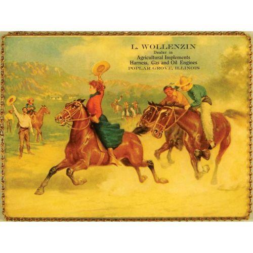 T. Wollezin sign, Poplar Grove, Illinois. Glass chain hanger. Depicting cowgirl winning horse race against a Cowboy and an Indian. Excellent condition. 8 X 6 inches.