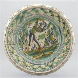 Spanyolország, 18. sz. közepe, ónmázas cserép, sérült, d: 66 cm, sérült