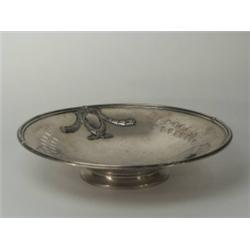 Ezüst, 202 g. Talpon álló kerek forma, furészelt mintás és applikált díszítéssel. Jelzett: német, XIX. sz-i magyar behozatali fémjelzéssel