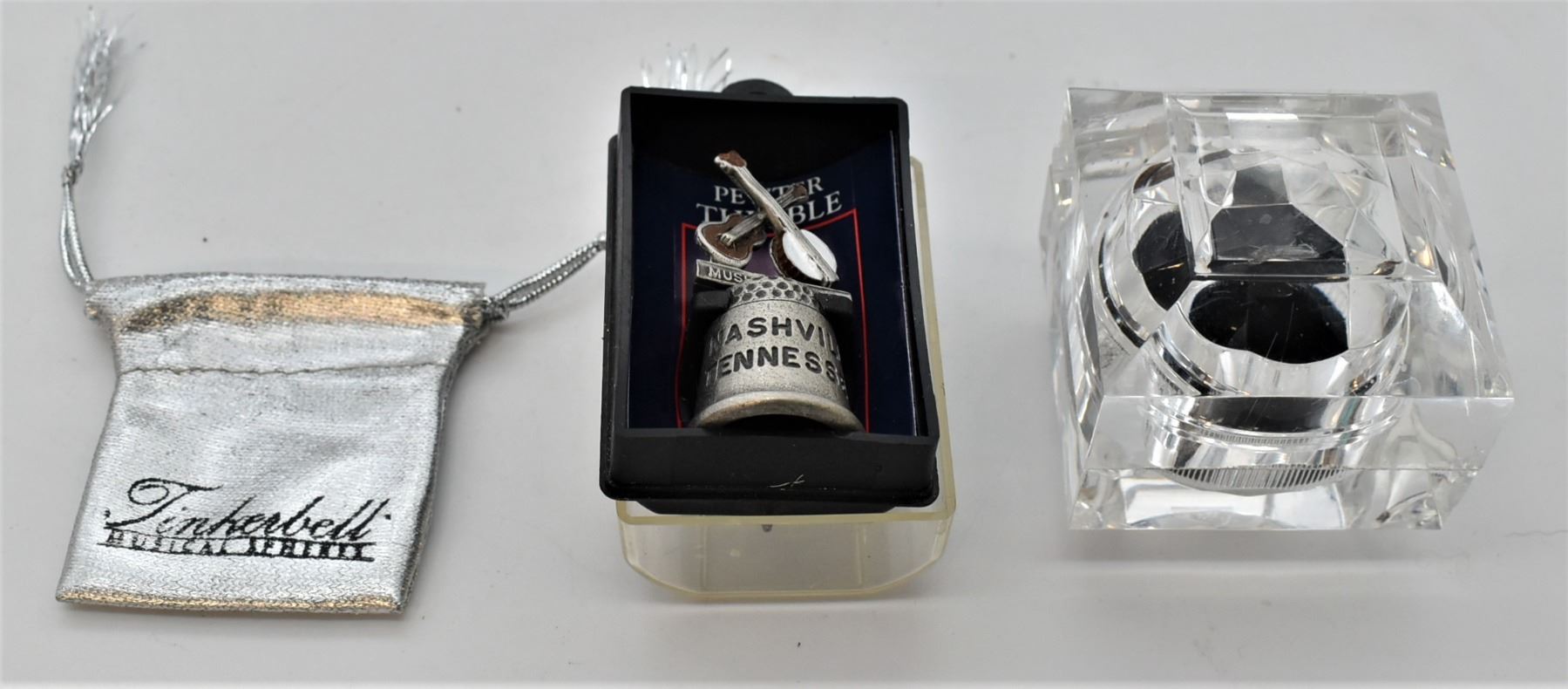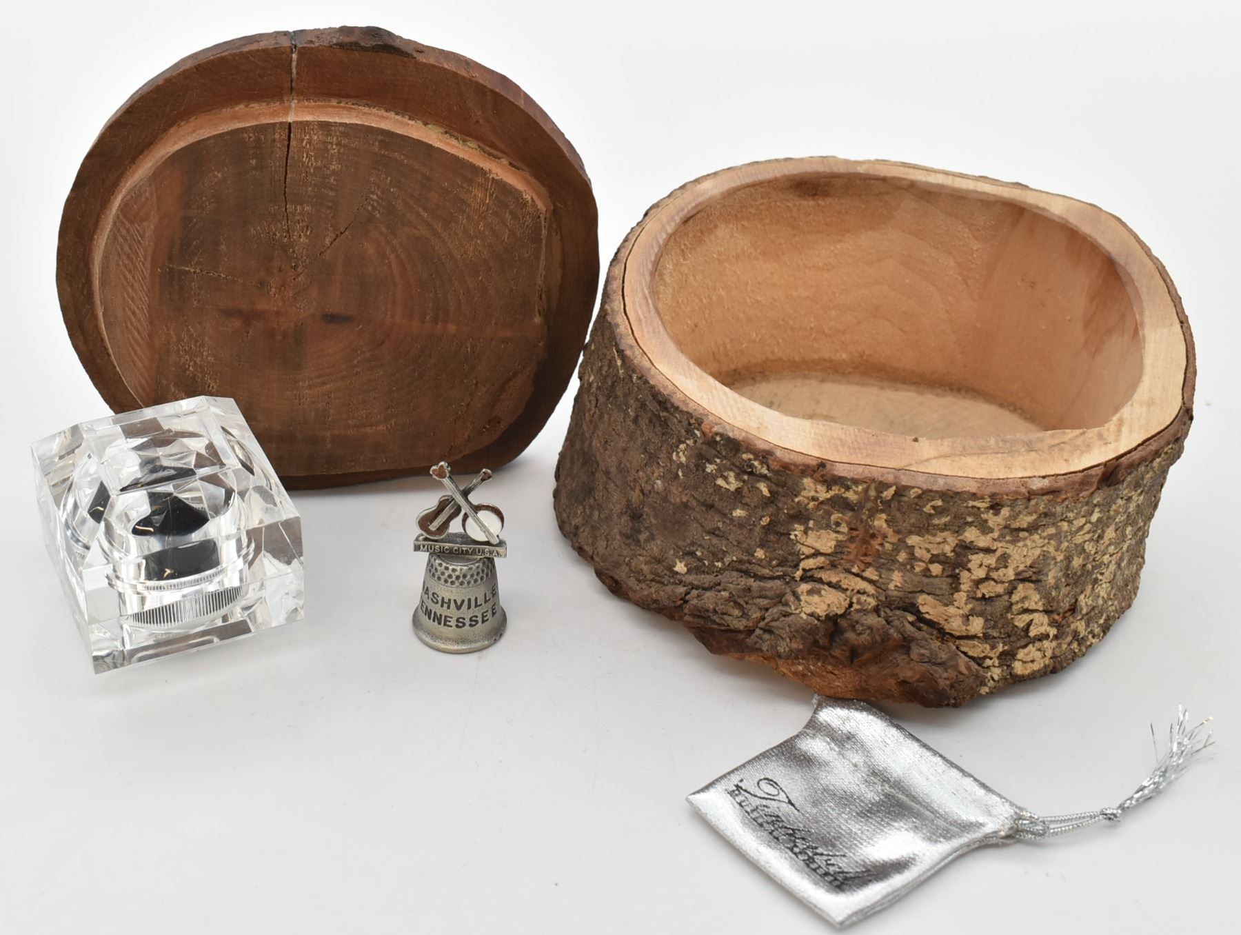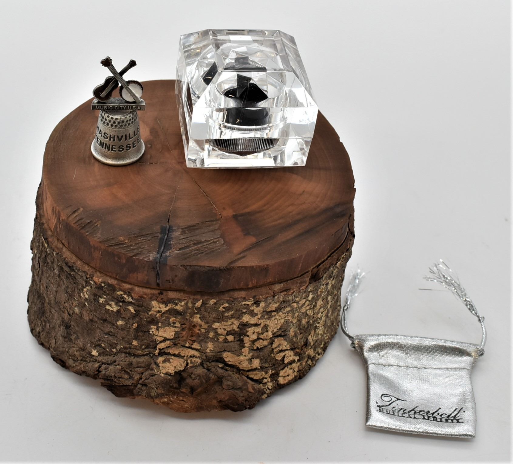 T's Creatives Alligator Juniper Trinket Box and Treasures, includes a pewter Nashville TN Thimble in original box, a Silver Lame' Tinkerbell drawstring pouch, and a mystery box, wood box measures 3.5'' x 5''