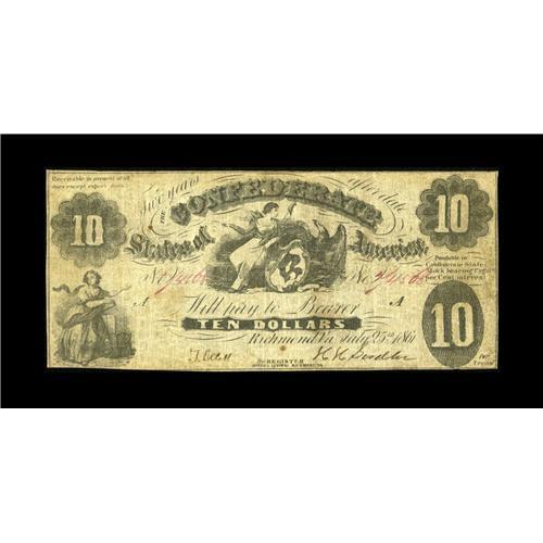 <B>T10 $10 1861.</B></I> The edges and paper are nice for the grade on this $10. <B>Fine,</B></I> CC.<BR><BR><b>Shipping:</b> Coin/Currency (<a target="_blank" href="http://www.heritageauctions.com/common/shipping.php">view shipping information</a>) <BR><BR><B>Important no