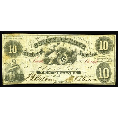 <B>T10 $10 1861.</B></I> Healthy edges envelope this $10 that was once mounted with stamp hinges in the corners and at center. <B>Fine-Very Fine.</B></I> <BR><BR><B>Important notice:<