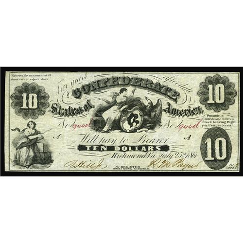 <B>T10 $10 1861.</B></I> This <B>Fine-Very Fine</B></I> $10 is just outside the Fricke condition census top ten for this design. The note is bright and free of edge tears and pinholes. The edges also lie outside the frame lines. All told, this leads to a very desirable note.<BR><I>From The Benjamin Rush Powel Collection of Confederate Currency.</B></I> <BR><BR><B>Important notice: