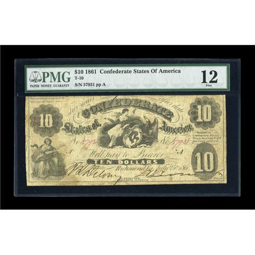 <B>T10 $10 1861.</B></I> This moderately circulated piece displays good paper quality and most importantly has not been cancelled. Overall, the design is solid and well detailed. <B>PMG Fine 12.</B></I><BR><BR><b>Shipping:</b> Coins & Currency (<a target="_blank" href="http://www.heritageauctions.com/common/shipping.php">view shipping information</a>)