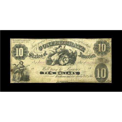 <B>T10 $10 1861.</B></I> This popular error features the double "For". Listed as PF-14, this is the plate note in <I>Collecting Confederate Paper Money</B></I> and enjoys a rarity 4+ rating. This is the sixth finest example known grading <B>Very Good+</B></I> with some mounting remnants on the back. <I>Ex-Fricke Collection.</B></I><BR><BR><b>Shipping:</b> Coin/Currency (<a target="_blank" href="http://www.heritageauctions.com/common/shipping.php">view shipping information</a>)