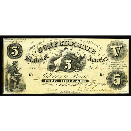 <B>T11 $5 1861.</B></I> A corner and a lateral center fold along with two approximate quarter inch top edge tears are noticed on this $5. A small top edge tear repair is also noticed. This note will surely climb near the high end of the Fricke condition census top ten. <B>Extremely Fine-About Uncirculated.</B></I><BR><I>From The Benjamin Rush Powel Collection of Confederate Currency.</B></I>