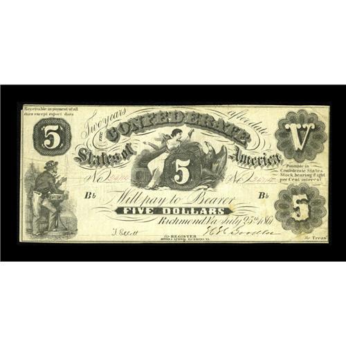 <B>T11 $5 1861.</B></I> T11s are scarce in any grade and this is a nice looking <B>Fine</B></I> example that displays even wear and just a couple of trivial edge tears. Even at this grade level this note is close to breaking into the Fricke Condition Census. This issue was a commercial work horse and only a few T11s are found better than this note.<BR><I>From The George P. Hammerly Collection</B></I><BR><BR><b>Shipping:</b> Coin/Currency (<a target="_blank" href="http://www.heritageauctions.com/common/shipping.php">view shipping information</a>)