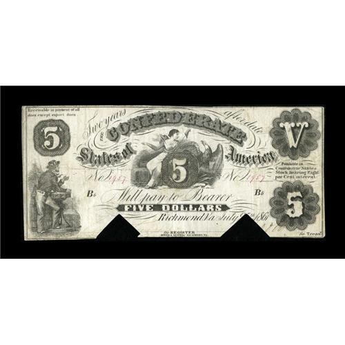 <B>T11 $5 1861.</B></I> This is a scarce CSA note with this being a choice note for the grade. The edges and paper are nice and the circulation is evenly dispersed across the note. A lightly pencilled "15" is found on the back along with a stamped "S.H.L. October 1861." COC/HOC notes are not priced in Fricke above G-VG. <B>Fine,</B></I> COC.<BR><BR><b>Shipping:</b> Coins & Currency (<a target="_blank" href="http://www.heritageauctions.com/common/shipping.php">view shipping information</a>)