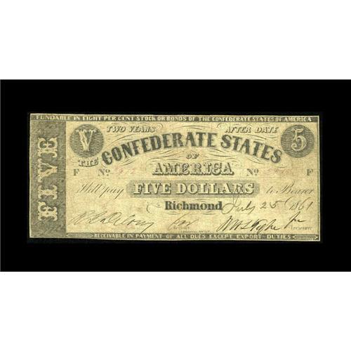 <B>T12 $5 1861.</B></I> Here is a very attractive note for the grade that shows only honest circulation. Snap remains, the edges are healthy, and the paper has avoided pinholes. <B>Very Good+.</B></I> <BR><BR><B>I