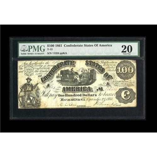 <B>T13 $100 1861.</B></I> Moderate amounts of wear and some uneven soiling are noted. <B>PMG Very Fine 20.</B></I><BR><I>From The Troy Wiseman Collection</B></I>