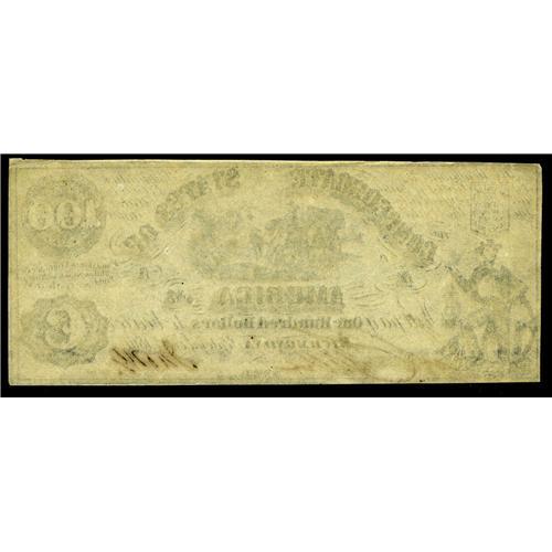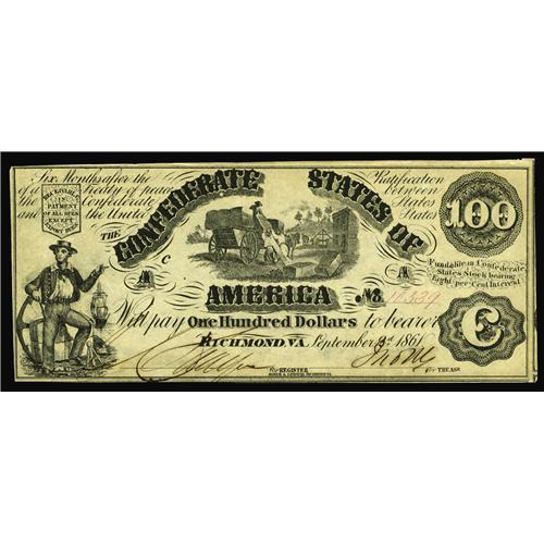 <B>T13 $100 1861.</B></I> The right-hand margin reveals a slice of the adjacent note, while the top edge exhibits a trivial nick at the widest point of the margin. Close inspection dictates that this note can jump from one fabulous collection to another.<BR><I>From The Benjamin Rush Powel Collection of Confederate Currency.</B></I>