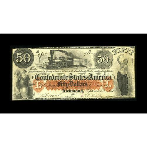 <B>T15 $50 1861.</B></I> This <B>Very Fine</B></I> $50 is nice enough to enter the Fricke Condition Census. In fact Fricke mentions that this type is very rare in uncut VF and that is exactly what this note is. Add in the original paper surfaces and you have one great note. It is noticed that the cut is close, there are a couple of pinholes, it was once mounted with stamp hinges, and there is a pencilled Criswell number on the back, but these are minor distractions and only attest to the note's originality.