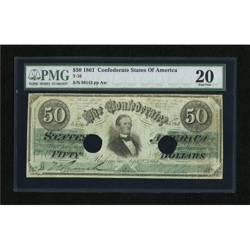 <B>T16 $50 1861.</B></I> This is an evenly circulated $50 with two punch cancels. <B>PMG Very Fine 20.</B></I><BR><BR><b>Shipping:</b> Coins & Currency (<a target="_blank" href="http://www.heritageauctions.com/common/shipping.php">view shipping information</a>)